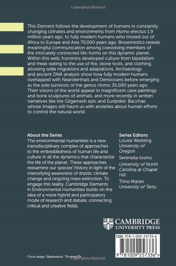 Цей елемент слідкує за розвитком людей у постійно мінливих кліматах та навколишньому середовищі з Homo erectus 1,9 мільйона років тому, до повних сучасних людей, які переїхали з Африки до європейської та Азії 70 000 років тому. Біосеміотика виявляє змістовне спілкування між членами, що співпрацюють, внутрішньо пов'язаних життєвих форм на цій динамічній планеті. В рамках цієї культури розвитку веб -гомінінів від двопедалізму та м'яса до використання вогню, кам'яних інструментів та одягу, що дозволяє відео міграції та адаптації. Археологія та древній ДНК -аналіз показують, наскільки повністю люди перетинаються з неандертальцями та денісованами, перш ніж стали єдиними вцілілими роду Homo 35000 років тому. Їх бачення світу з'являються у чудових печерних картинах та кісткових скульптурах тварин, а потім останнім часом у письмових розповідях, таких як епос Гілгамеша та Баха Евріпіда, зображення яких все ще розпускають нас із занепокоєнням щодо людських зусиль, щоб контролювати контроль за контролем комфорту для контролю над комфортами для контролю за контролем точних справ природного світу.