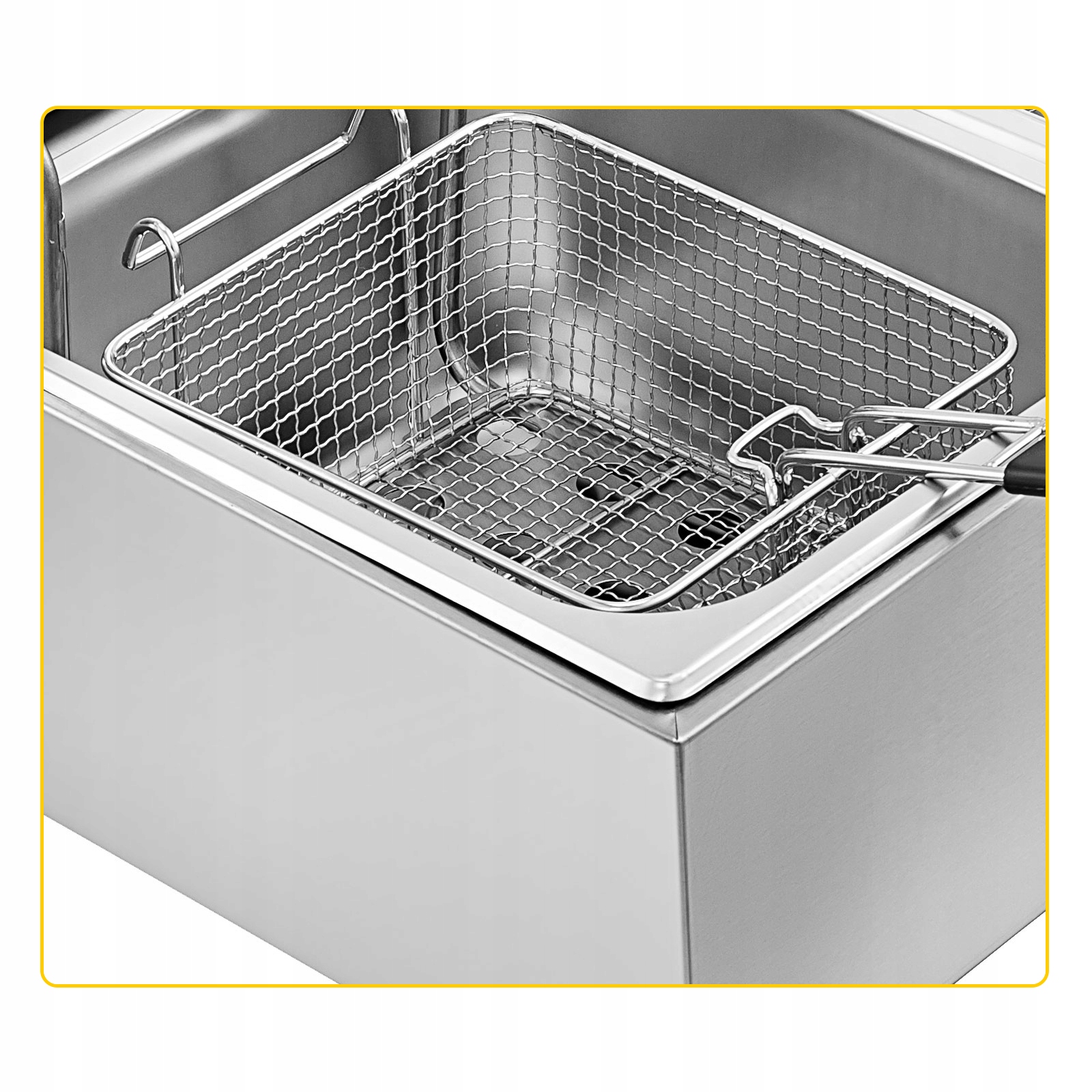 Ця 12-літрова електрична фритюрниця з двома баками потужністю 5000 Вт має конструкцію з нержавіючої сталі. Він призначений для комерційних застосувань, таких як ресторани, супермаркети, магазини швидкого харчування, закусочні тощо. Щоразу смажте свою фірмову страву до досконалості за допомогою цієї 6-літрової комерційної подвійної фритюрниці. Виготовлений із високоякісної комерційної нержавіючої сталі та оснащений двома зануреними елементами потужністю 2500 Вт для швидкого нагрівання.