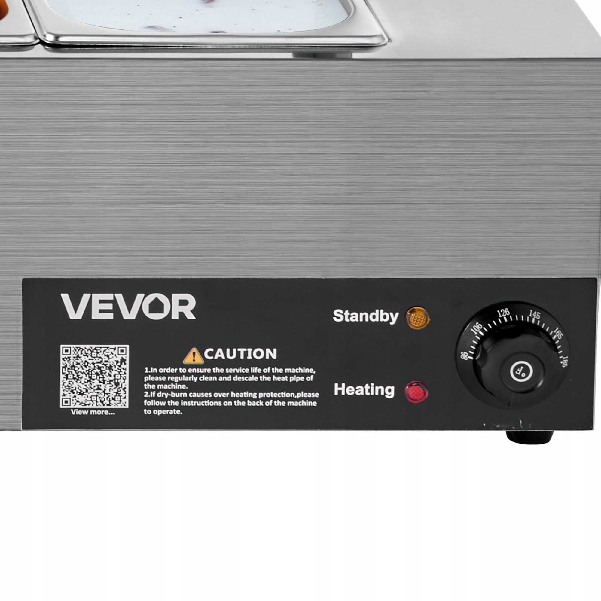 Ця марміт виготовлена ​​з міцної нержавіючої сталі, яка легко миється. Він має широку U-подібну нагрівальну трубку, регульовану температуру (30-85°C/86-185°F) і велику камеру, що робить його ідеальним для готелів, фуршетів, снек-барів і вечірок на відкритому повітрі.
