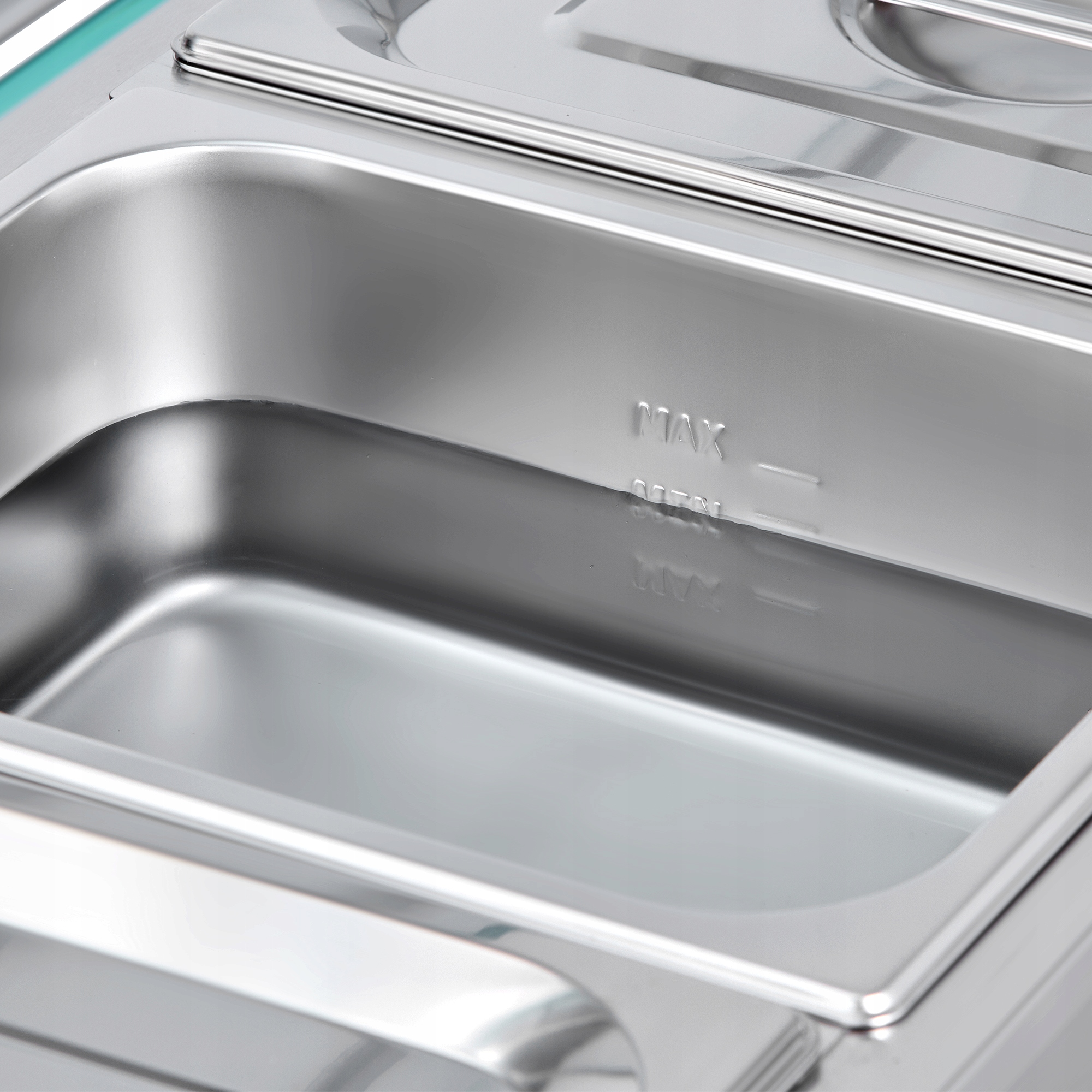 Наш електричний підігрівач їжі має закруглені кути для легкого чищення та доступний у різних розмірах. Додаткові лотки доступні окремо, і їх можна гнучко регулювати відповідно до різних потреб. Міцна безшовна конструкція полегшує щоденне очищення та обслуговування.
