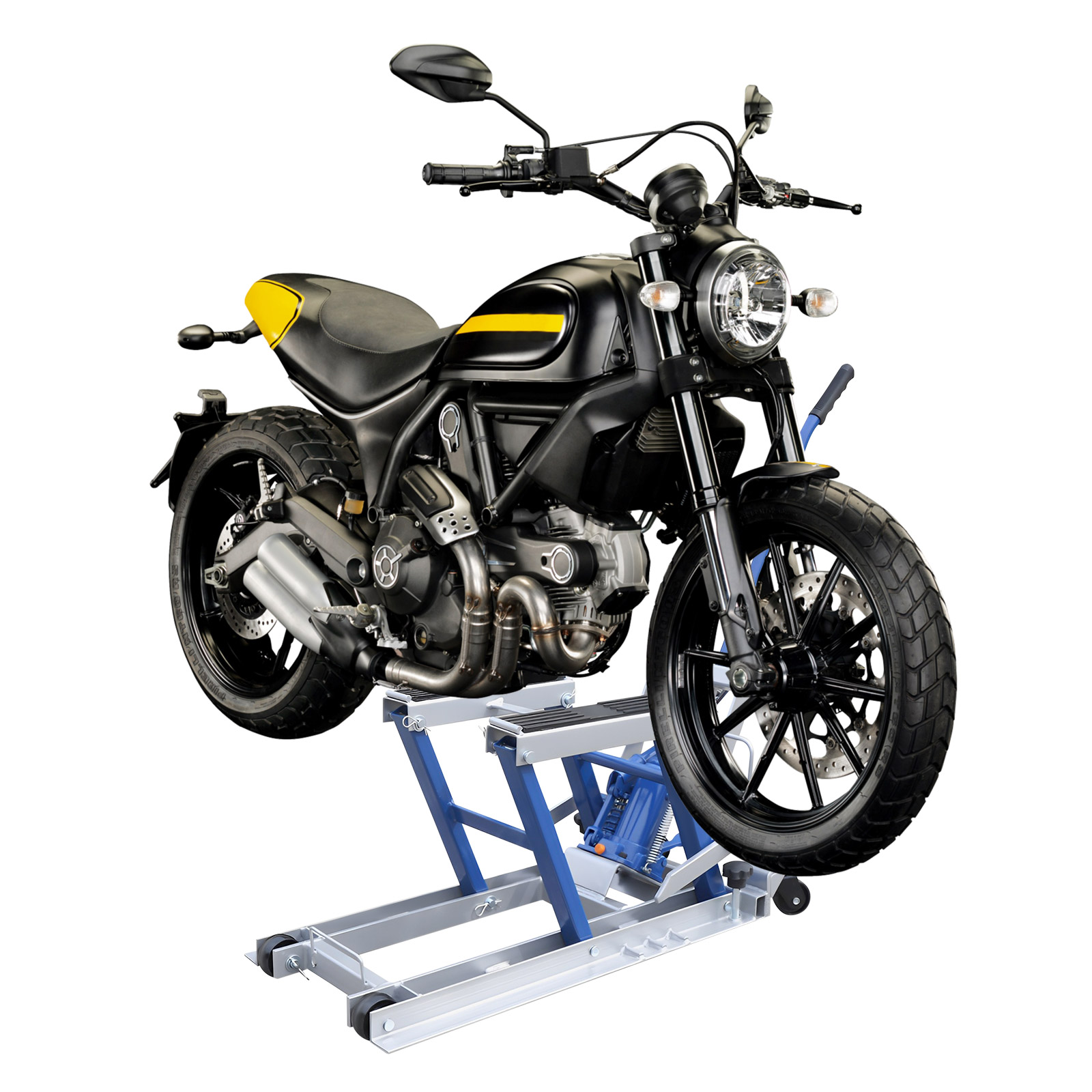 - Гідравлічний підйомний механізм: Оснащений ножною педаллю та потужним гідравлічним насосом, ви можете піднімати мотоцикли і легко регулюйте їх висоту підйому в діапазоні від 4,7 до 15,2 дюймів, що забезпечує легкий доступ до коліс, підвіски та інших компонентів під час технічного обслуговування чи ремонту.