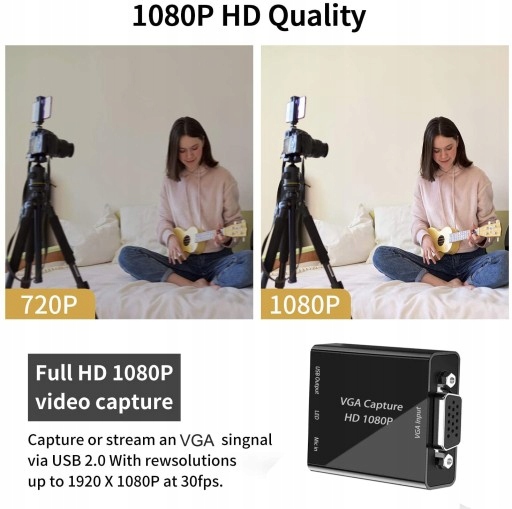【Карта відеозапису з роздільною здатністю Full HD 1080P 30 кадрів/с, VGA – USB 2.0, підтримує вхід VGA, записує відео до 1080p зі швидкістю 30 кадрів/с без затримки. Чудовий зовнішній пристрій захоплення для ноутбука, комп’ютера, приставки, blue-ray тощо.