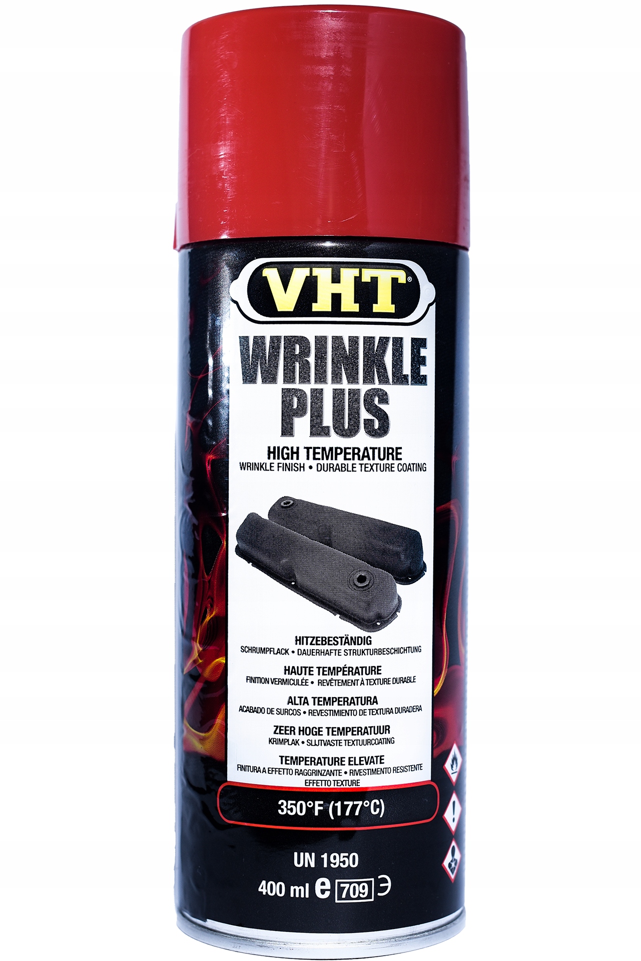 VHT Wrinkle Plus™ поєднує інтенсивні кольори з цікавою та нестандартною текстурою для досягнення незвичайного вигляду. Він термостійкий до 350°F (177°C) і ідеально підходить для фарбування всіх металевих поверхонь. VHT Wrinkle Plus™ стійкий до вицвітання, жиру, розчинників і несприятливих погодних умов. У той же час покриття є надзвичайно міцним і стійким до іржі, корозії, відколів і тріщин.