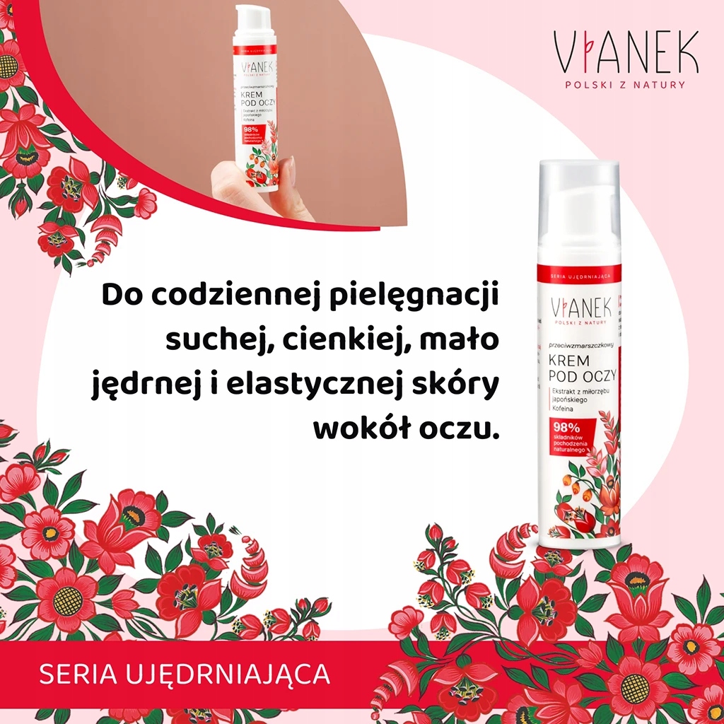 Забезпечте шкірі навколо очей найкращу підтримку з унікальним кремом від зморшок VIANEK. Створений спеціально для щоденного догляду за сухою, тонкою, не дуже пружною та еластичною шкірою навколо очей. Допомагає зберегти здоровий і молодий вигляд.