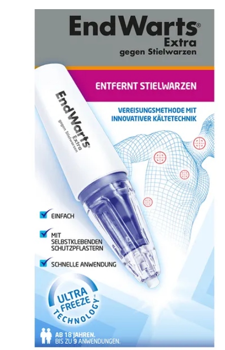 EndWarts EXTRA проти бородавок на ніжці - ефективний спосіб самостійного лікування бородавок на ніжці на шиї, грудях і пахвах. Лікування призначене для дорослих віком від 18 років.