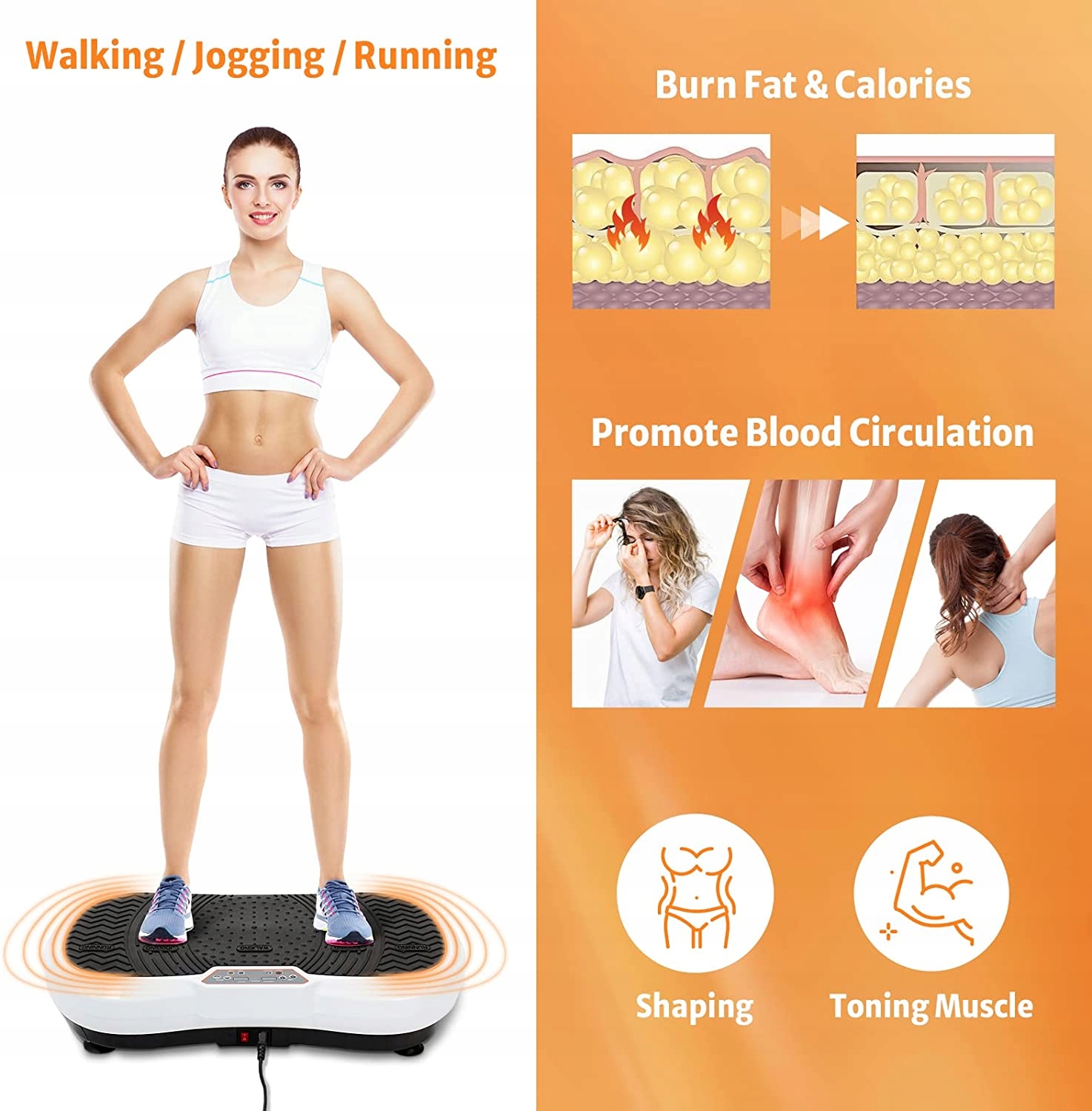 - ІДЕАЛЬНО ДЛЯ ФІТНЕСУ: вібраційна пластина для вправ – ідеальний продукт для людей, які піклуються про своє здоров’я, оскільки вона допомагає схуднути, зменшити целюліт, наростити м’язи, тонізувати частини тіла, підтягнути тіло тощо та навіть допомагає ви знімете стрес після довгого робочого дня.