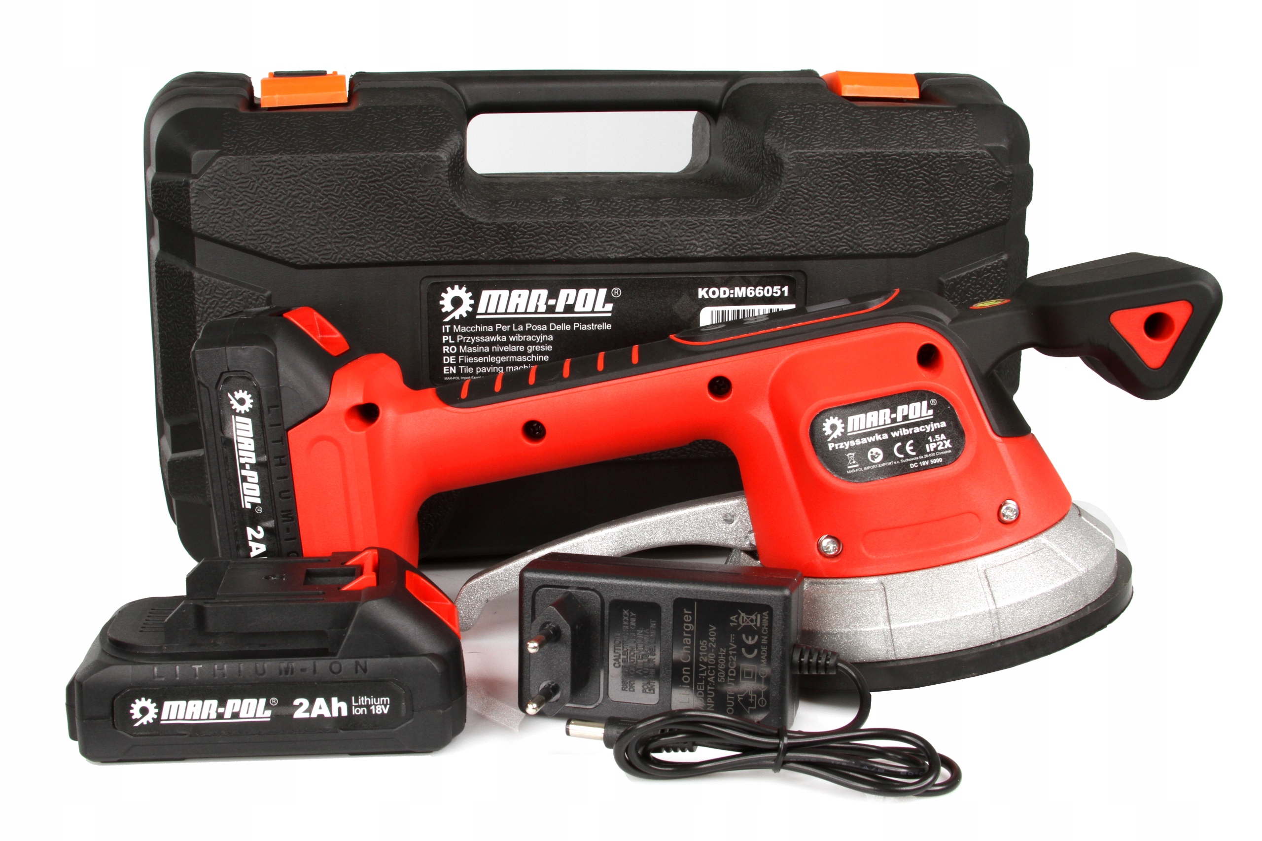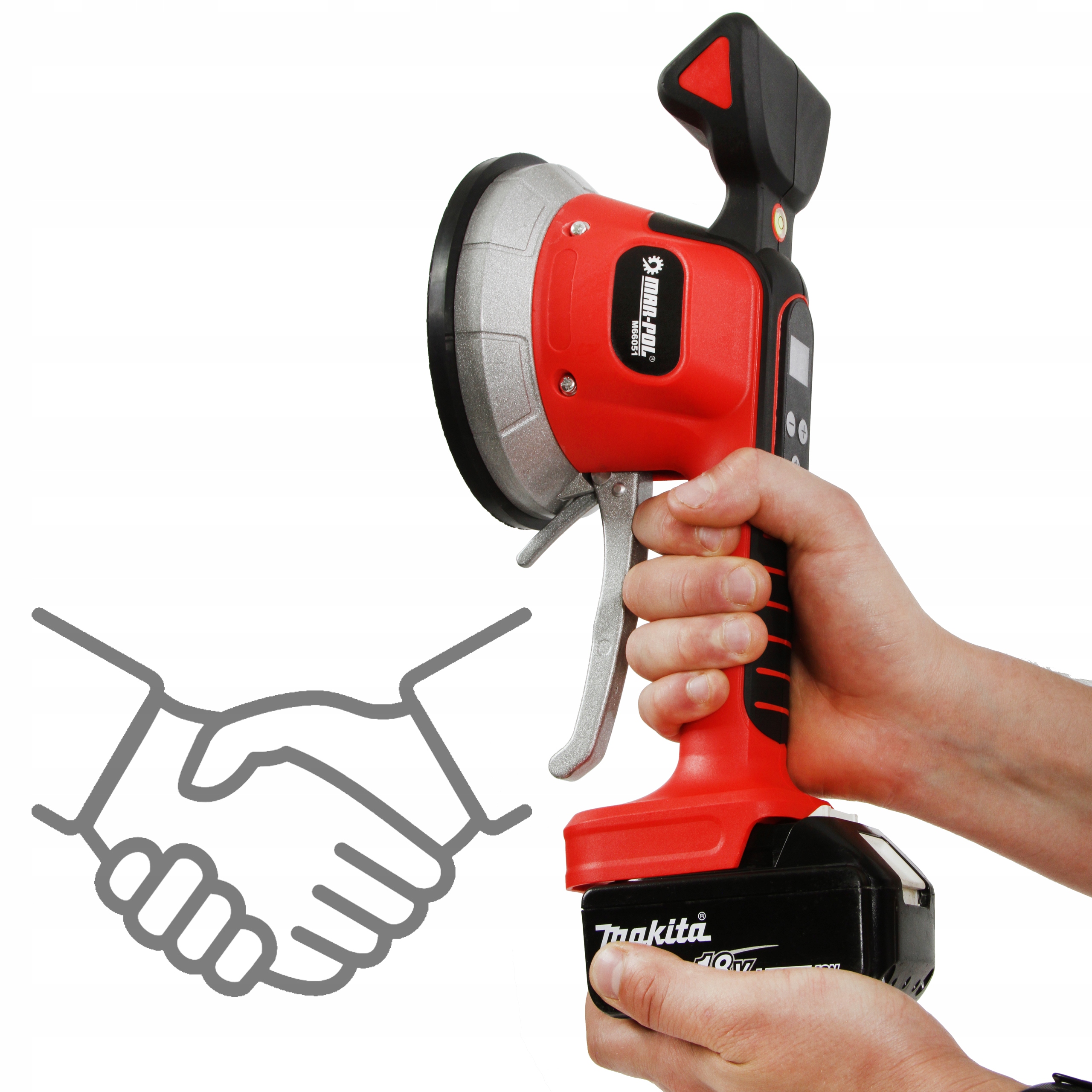 Присоску MAR-POL, що живиться від літієвої батареї 18 В, можна використовувати для внутрішньої та зовнішньої установки. Він замінює традиційну ручну роботу та допомагає уникнути проблем через неправильний розподіл клею під плиткою та великими плитами.