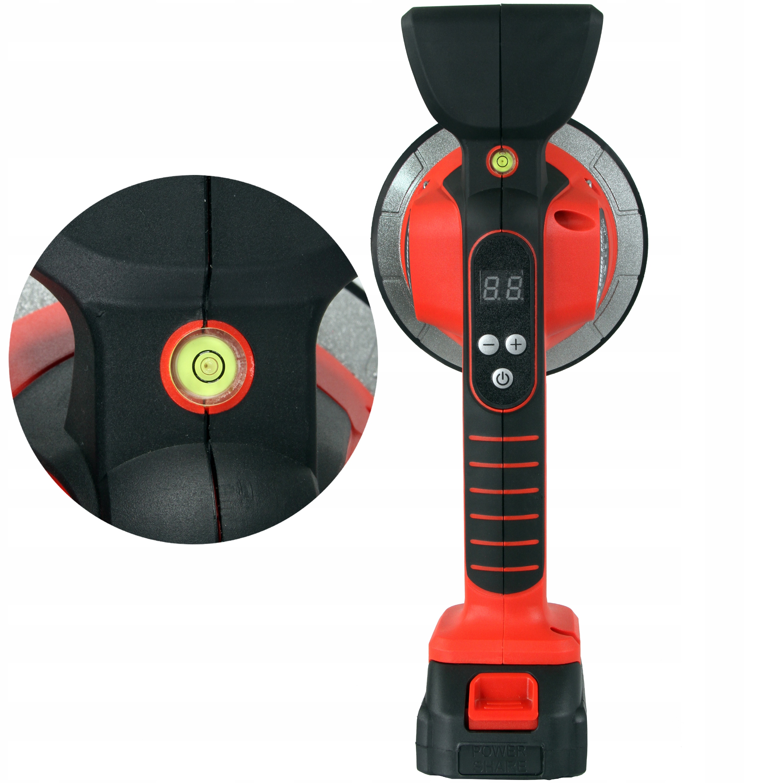 Він дуже компактний і легкий, і дозволяє позиціонувати плитку за допомогою присоски (можна піднімати до 50 кг), і завдяки вібрації видаляє залишкові бульбашки повітря, які, потрапляючи між клеєм і плиткою, спричиняють можливі тріщини. Інтенсивність вібрації регулюється натисканням перемикача.