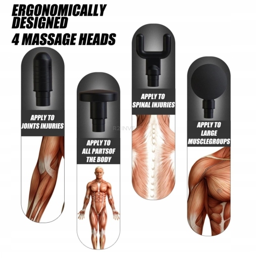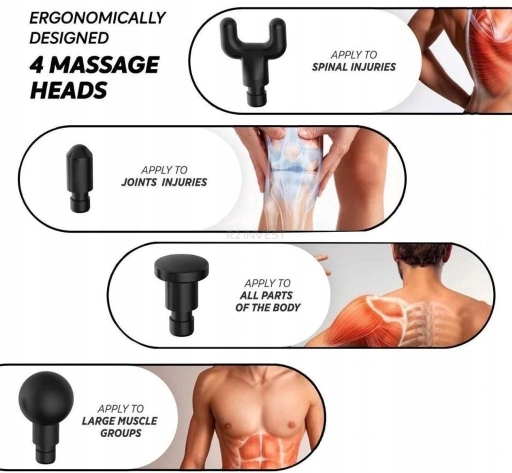 - 4 змінні насадки для точного масажу різних груп м'язів
