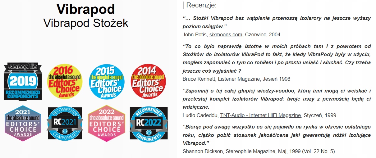 Vibrapod — це один із найдешевших методів «оновлення» аудіосистеми, і в кожній вдосконаленій і стандартній аудіосистемі завжди є ізолятори , основи, підкладки чи платформи, які гасять і усувають вібрацію та резонанс.