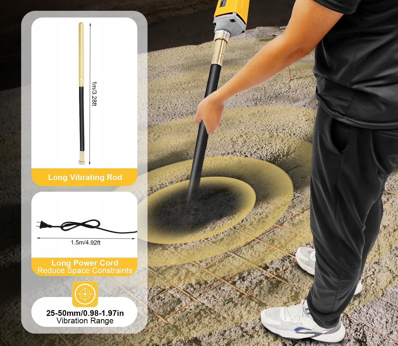 Work Assistant: Усуває повітряні бульбашки в бетоні та збільшує щільність бетону, одночасно забезпечуючи рівномірне наливання бетону на сталевий каркас (не входить до комплекту), таким чином покращуючи міцність усієї будівлі.