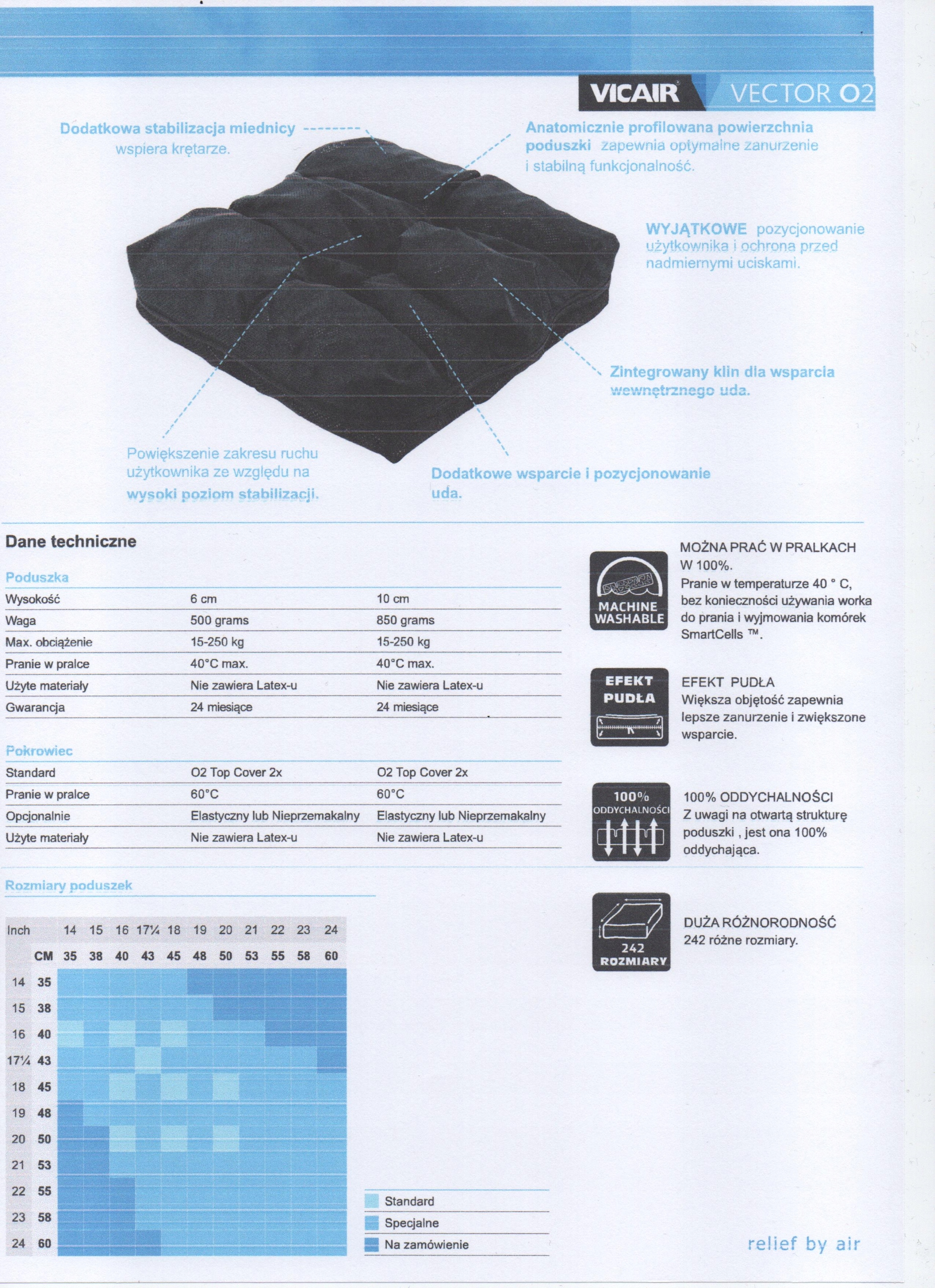 вектор O2 складається з 8 камер, кожна з яких виконує власну функцію. Завдяки унікальній конструкції, подушка забезпечує ефективний розподіл тиску, що робить його ідеальною подушкою проти стовбура. Поверхня анатомічної форми сидіння забезпечує високий рівень стабілізації та підтримки оптимального положення сидіння. Клітини SmartCells мають специфічну форму та структуру, що оптимально забезпечує ефективність. З жовтня 2017 року вони мають гарантію міцності на все життя