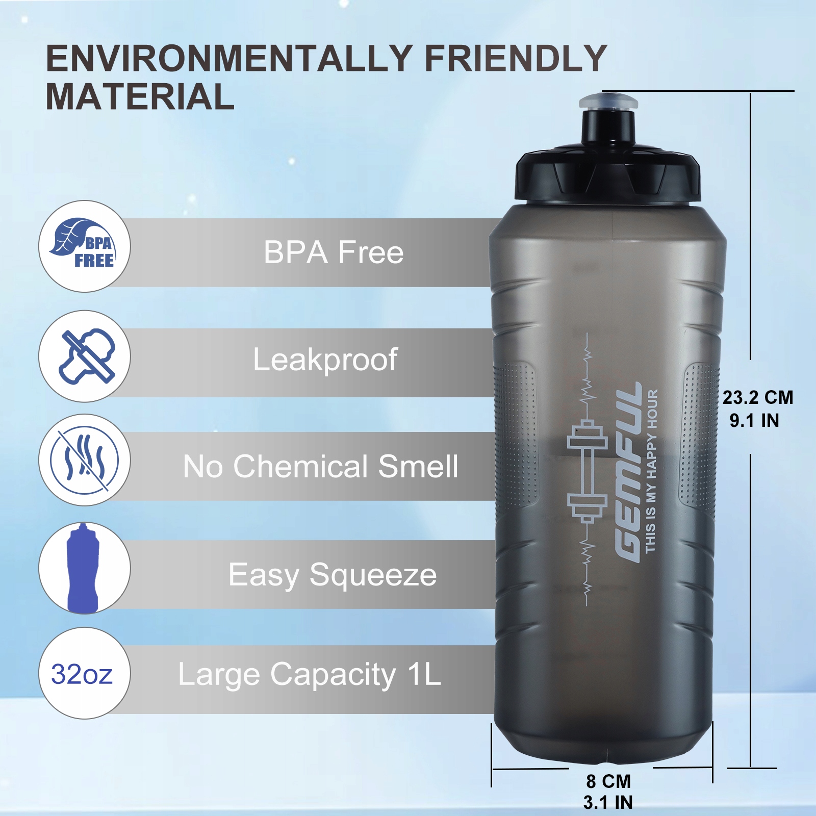 Ця легка пляшка потужністю 32 унції (продається в 2 упаковці) може похвалитися комфортною, однорукою для видавлення. Елегантні контури забезпечують ідеальний контроль зчеплення як для спортсменів, любителів фітнесу, так і зайнятих професіоналів.
