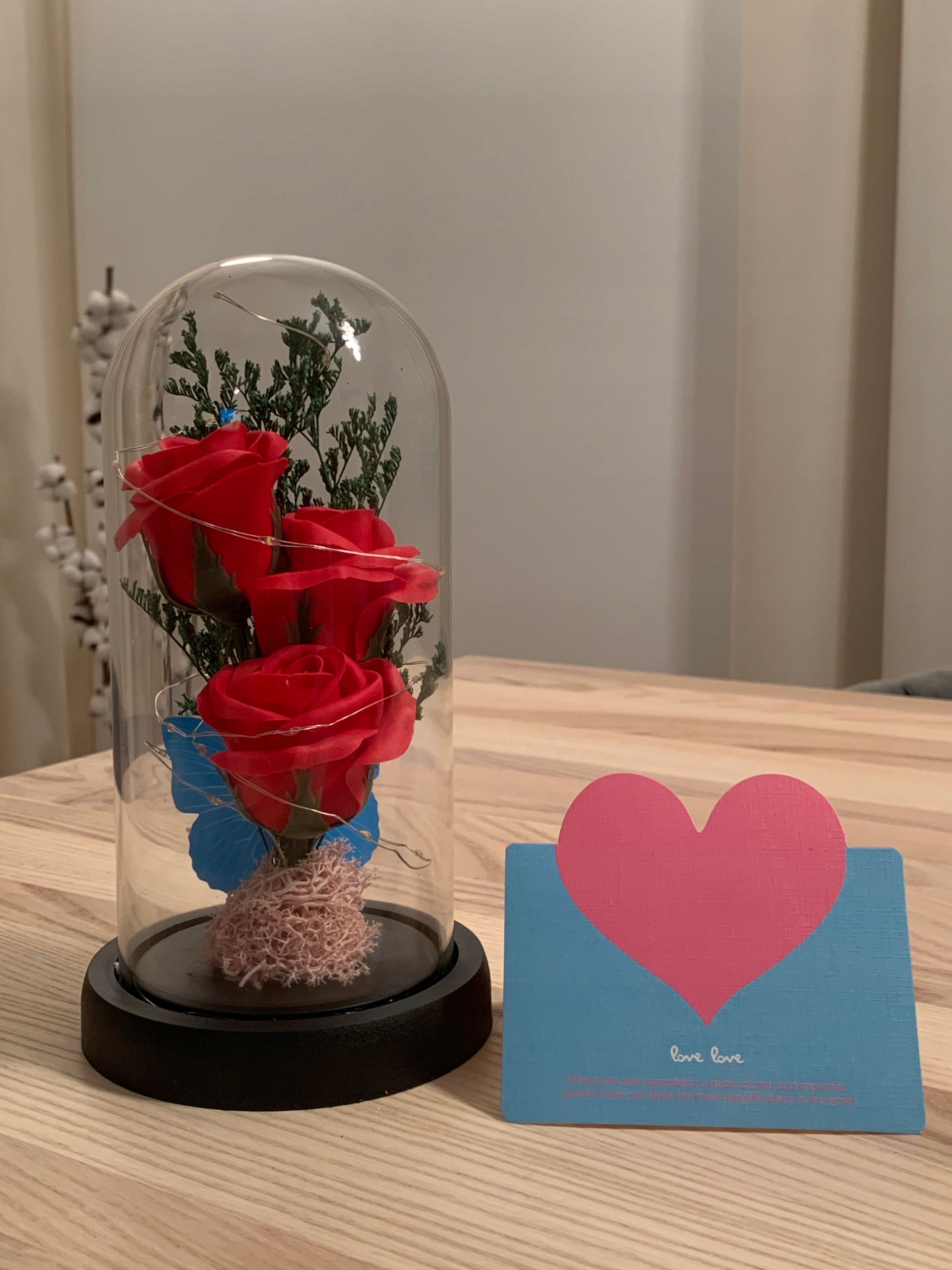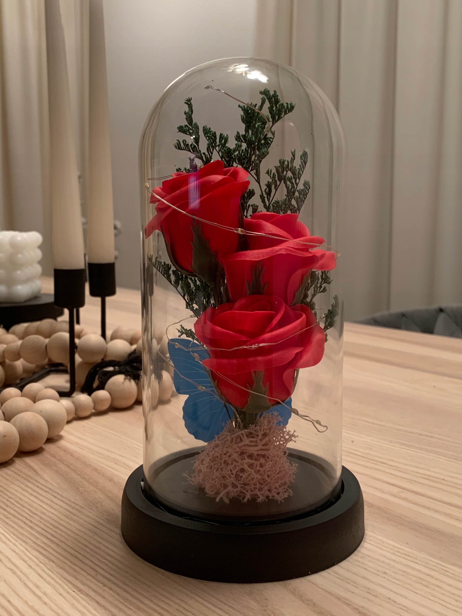 Шалено романтична та елегантна червона потрійна штучна троянда виглядає як справжня у скляному куполі з теплим білим світлодіодним підсвічуванням.