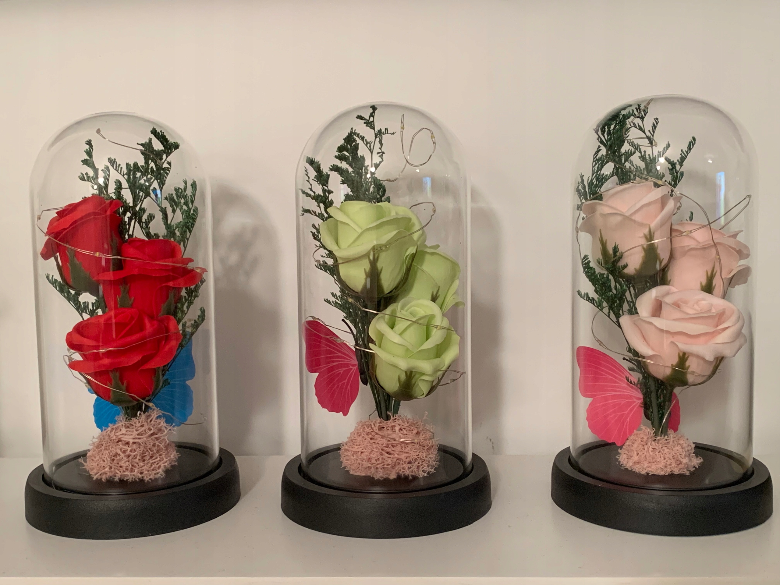 The Предметом цієї пропозиції є три червоні троянди різної висоти з трьома пелюстками троянд, приклеєними до основи (у світлому відтінку дерева) - все це приховано в красивому скляному куполі та підсвічується світлодіодами, що дають тепле біле світло - як на фото поруч.