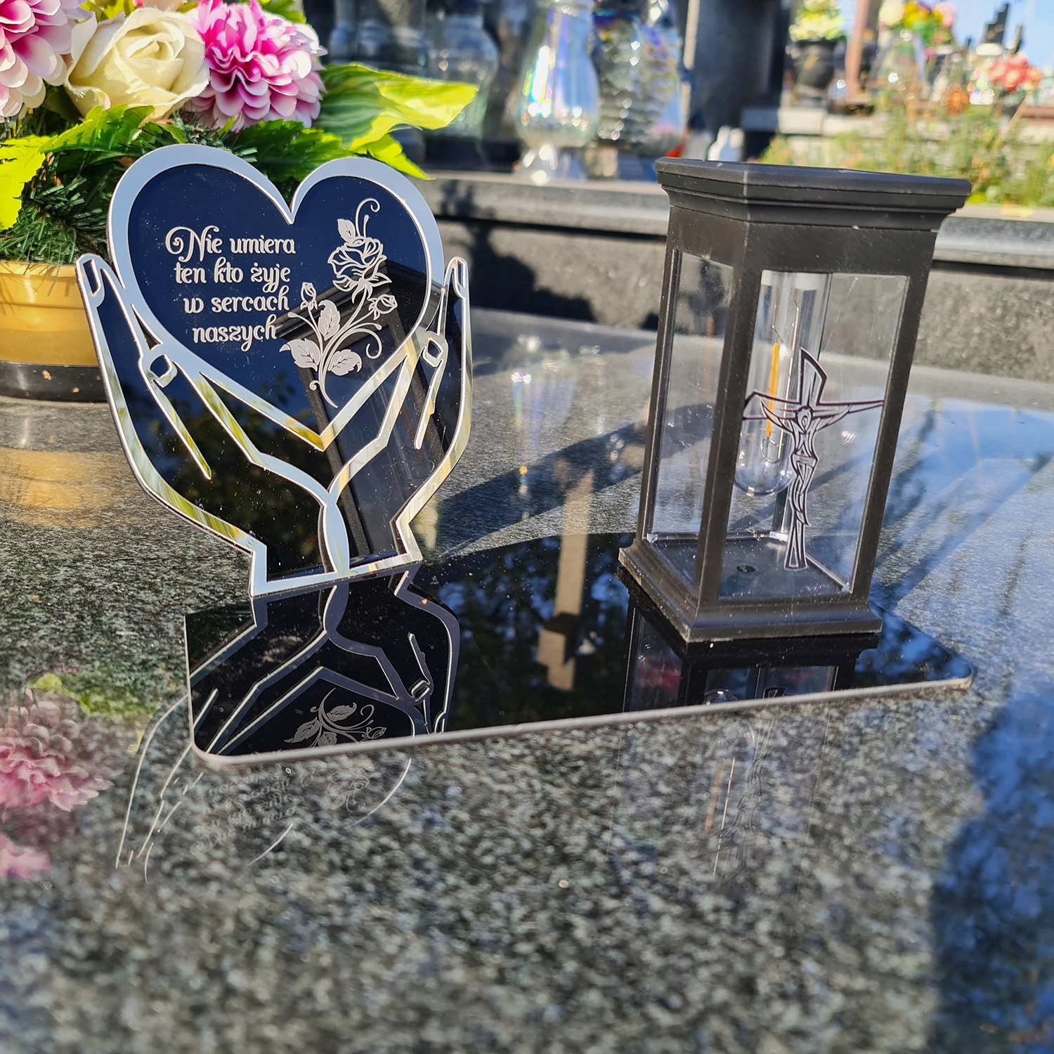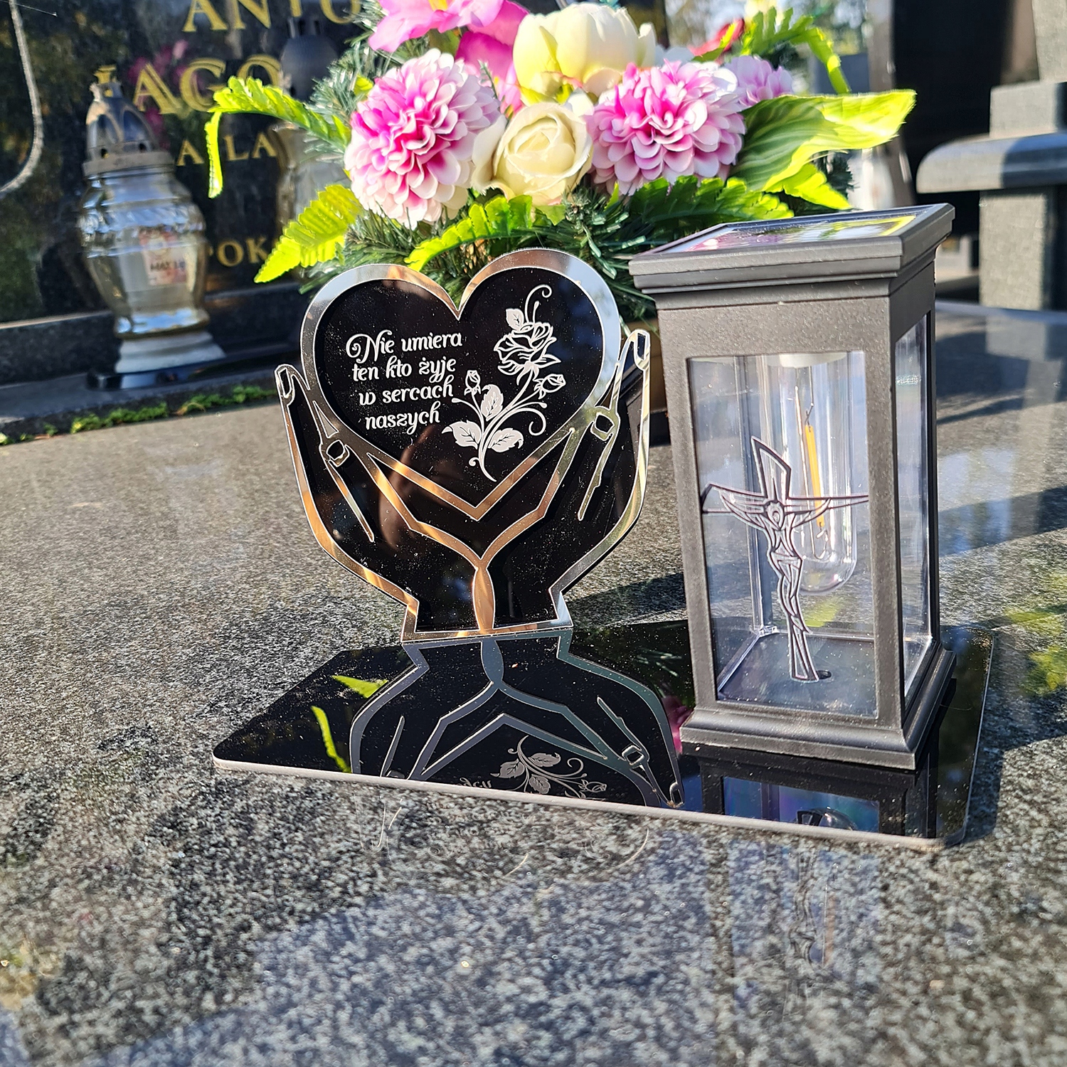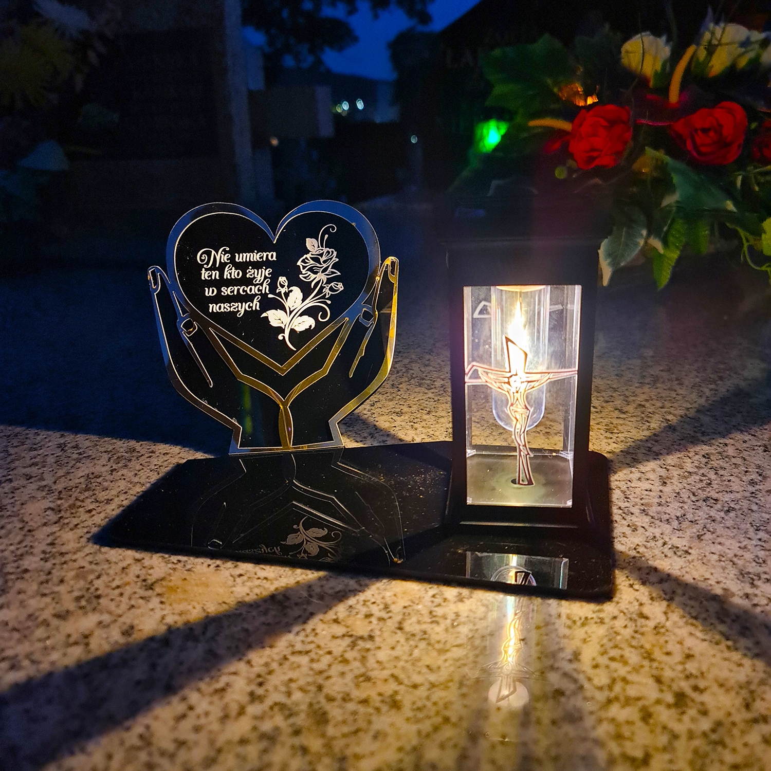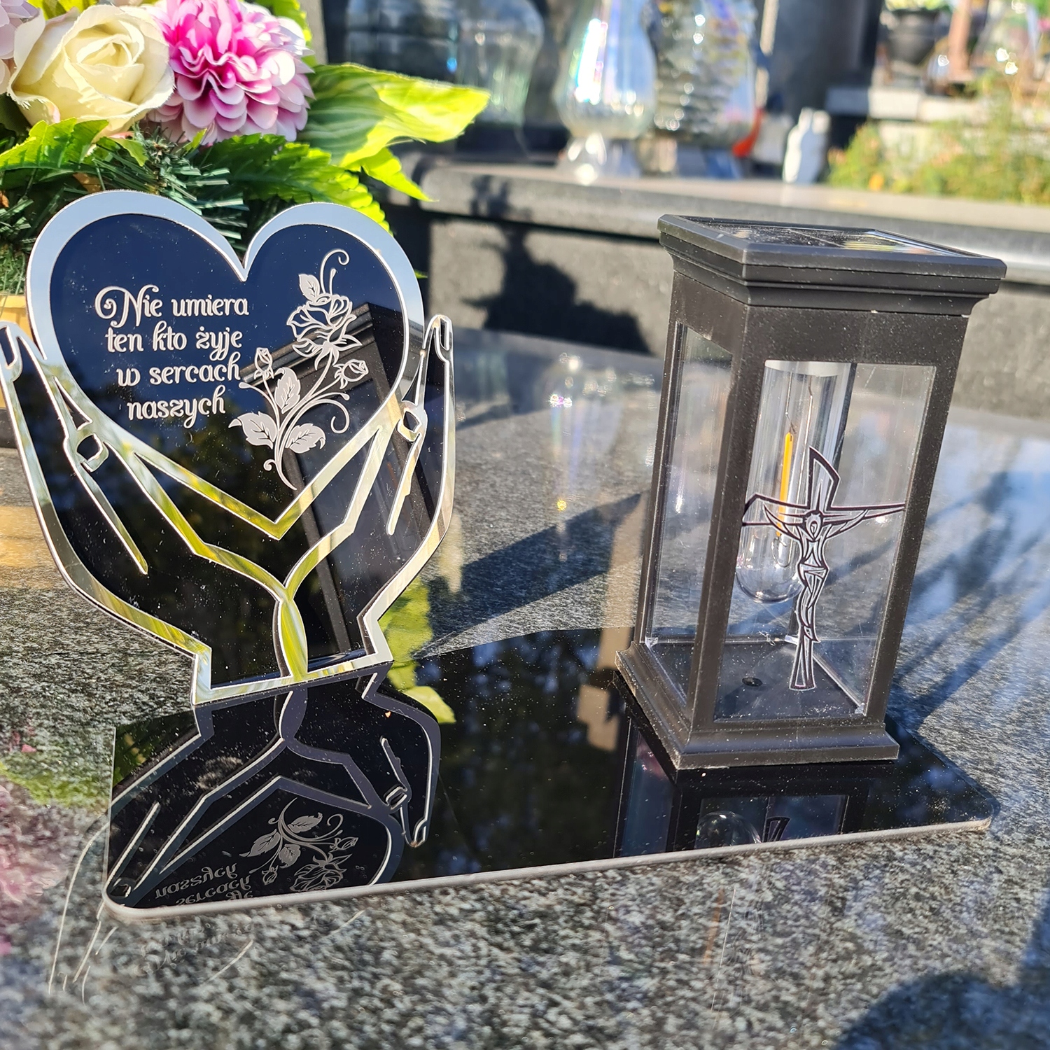 Eternal solar candle for a grave with an engraved acrylic glass stands decorated with the motif of golden hands with heart h2>
