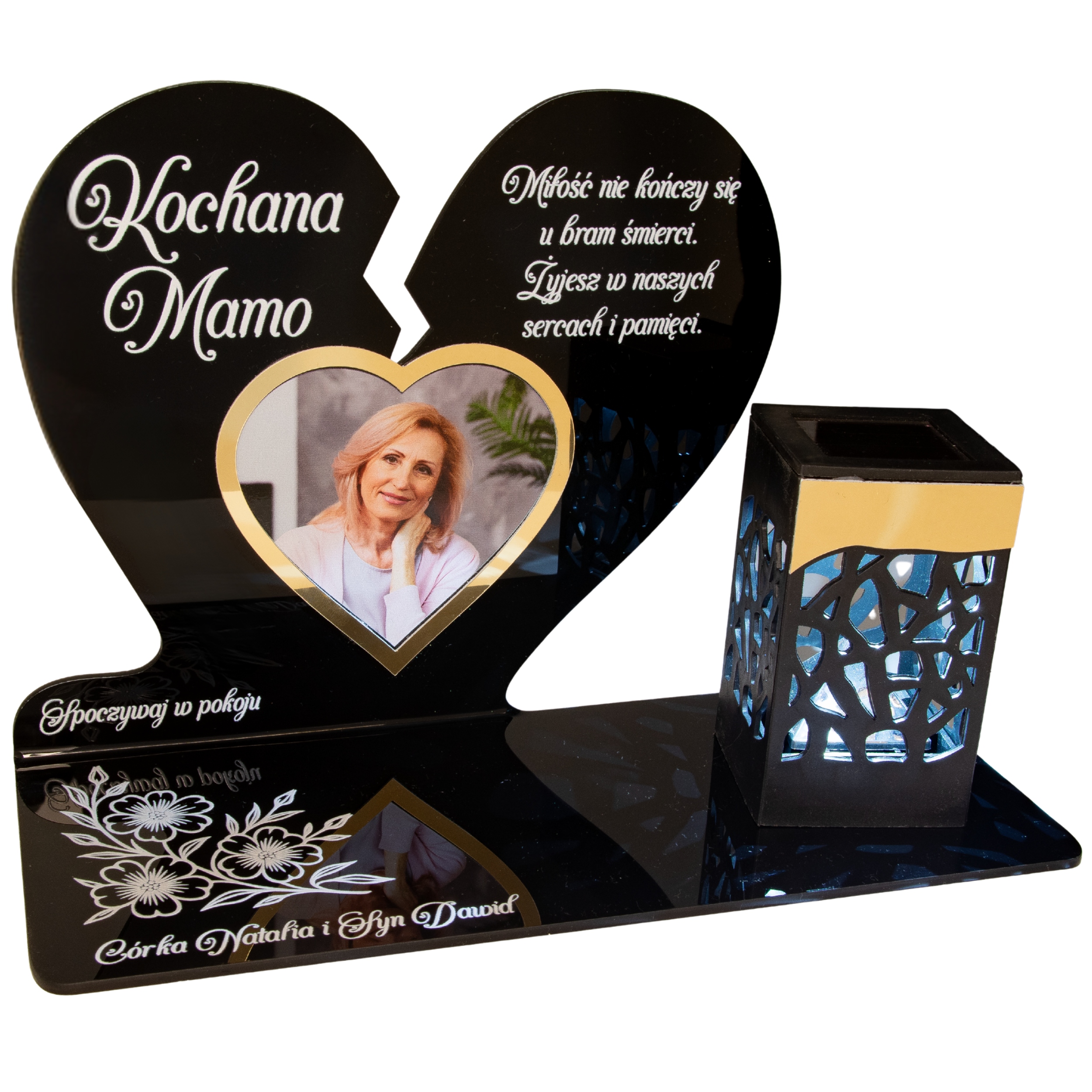 У центрі золота рамка у формі серця з фотографією коханої людини. Поруч із ним є зворушлива присвята та підпис родини, що надає всьому надзвичайно особистого характеру.