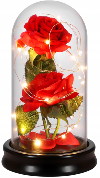 Наша вічна троянда оточена світлодіодними лампами, які чудово освітлюють її. Завдяки цьому виглядає надзвичайно ефектно. Поставлений на тумбочку, комод або стіл, квітка створить чарівну атмосферу, яка нагадуватиме про ваші почуття.