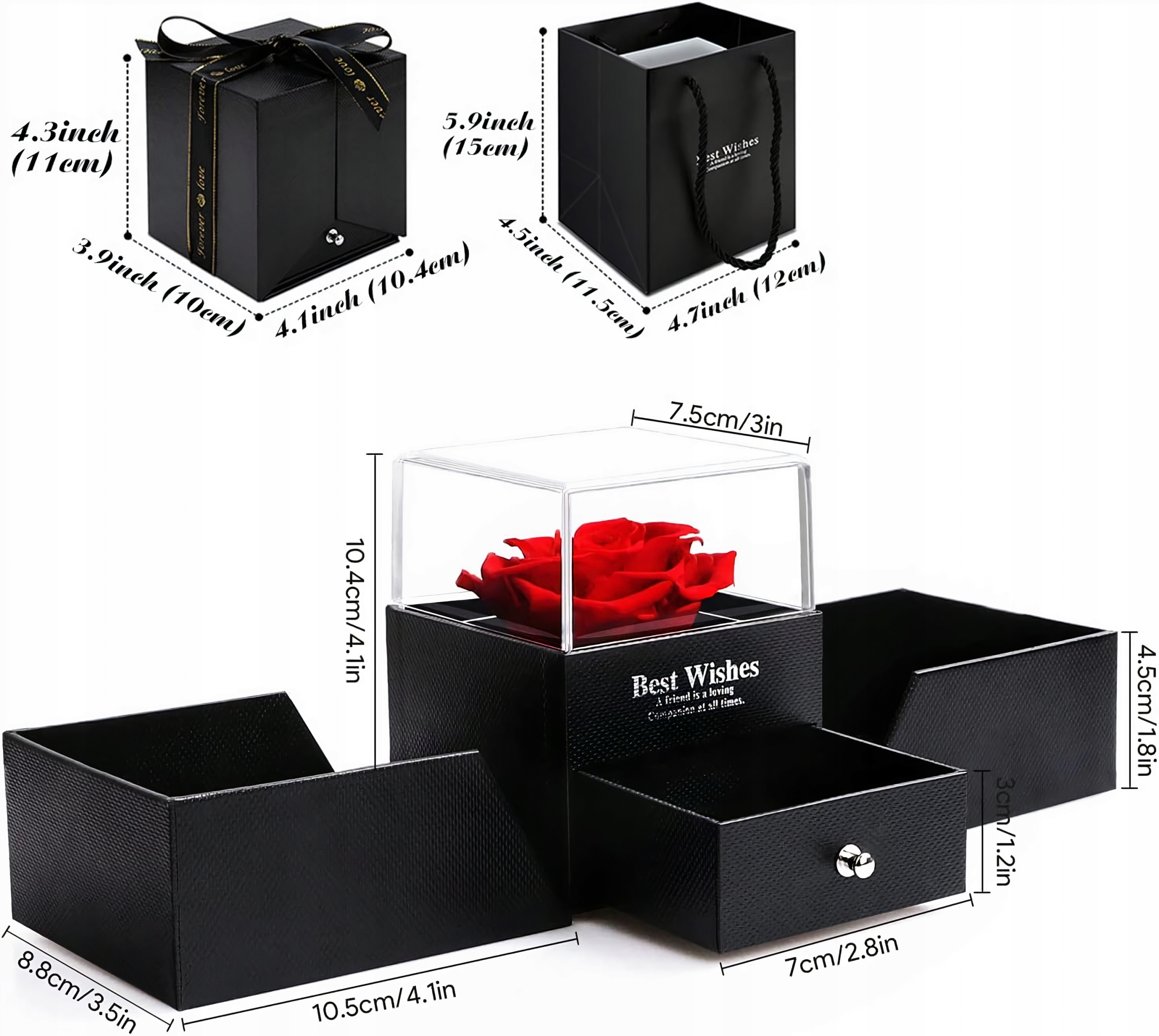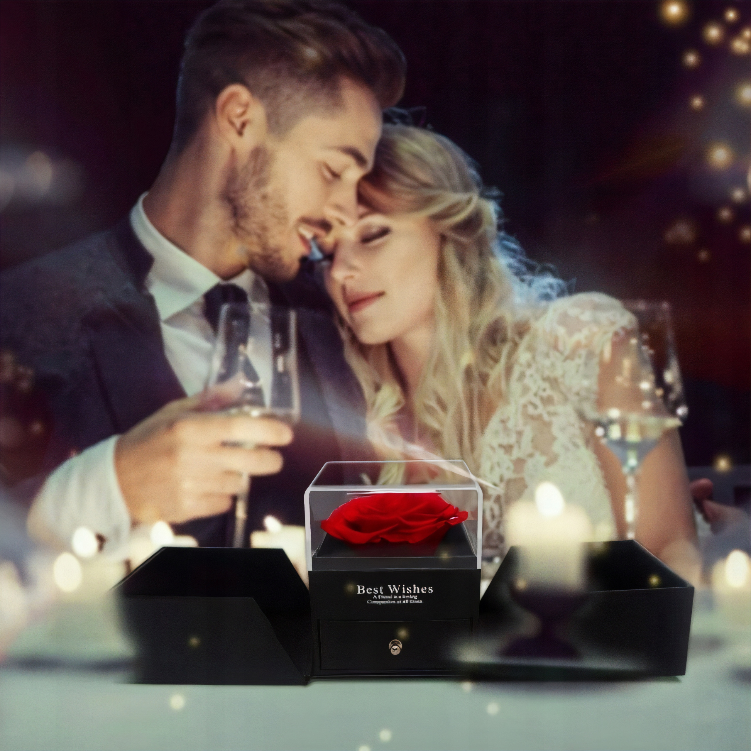 Троянда зберігається на вічну міцність.< /b > Він залишається таким же свіжим, як і в день його збору, і не потребує поливу! У коробці він виглядає шикарно та елегантно. Натхненний казкою «Красуня і Чудовисько». Упакований у велику чорну елегантну коробку, це квінтесенція розкоші та РОМАНТИЗМУ.