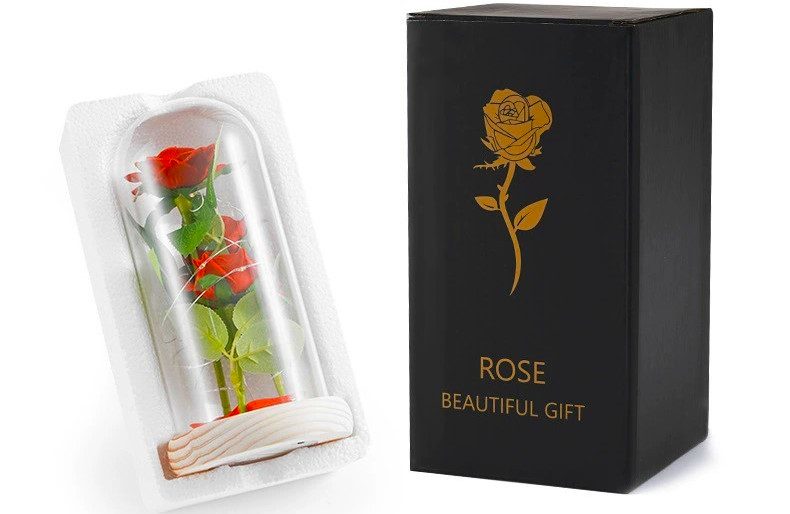 троянда вставлена під скляний купол, який захищає його від руйнування та пилу. Завдяки цьому ви можете бути впевнені, що він не буде знищений і буде чудовим подарунком на багато років