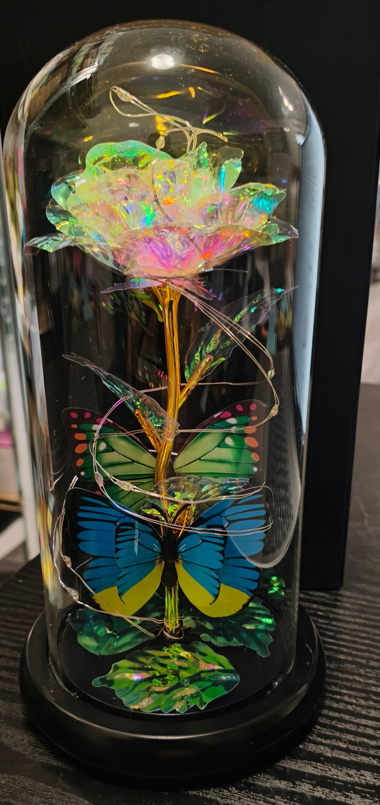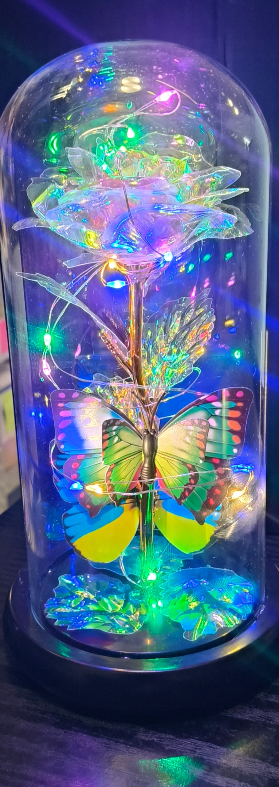 Хочеш подарувати квіти, але боїшся, що вони швидко зів'януть? Вічна троянда в склівирішить вашу проблему. Це ідеальна ідея подарунка для вашої дівчини, дружини, матері чи іншої близької вам жінки. Троянда укладена під скляний плафон. Все це підсвічується світлодіодною панеллю. Прикраса виглядає дуже елегантно. Він міцний і підходить для інтер'єрів, оформлених у різних стилях.