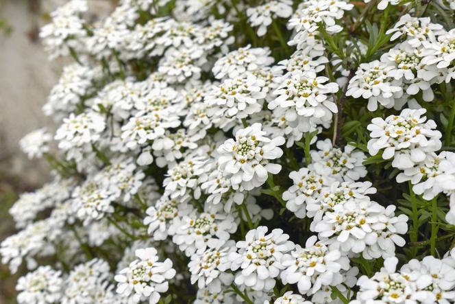 Надзвичайно чарівна вічнозелена рослина, яка створює привабливі щільні килими. Він досягає приблизно 25 см у висоту та приблизно 40 см у діаметрі. З квітня по червень рослина прикрашають чарівні, білі з жовтою серединкою квітки, які зібрані в невеликі зонтичні суцвіття. Це одне з найбільш перевірених і надійних рослин, які цвітуть навесні.