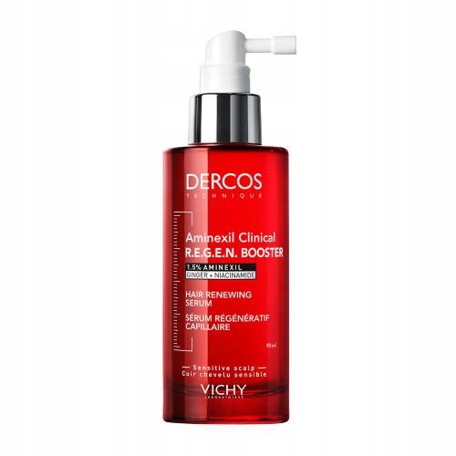 Сироватка VICHY DERCOS R.E.G.E.N, що зміцнює та стимулює волосся, використовує інноваційну формулу проти випадіння волосся, засновану на 30-річних дослідженнях. Зменшує випадання волосся та стимулює ріст нового за рахунок підвищення активності клітин волосяної цибулини. Формула з клінічно підтвердженими результатами, збагачена 1,5% амінексілу та 3% ревіталізуючої есенції з ніацинамідом і екстрактом імбиру