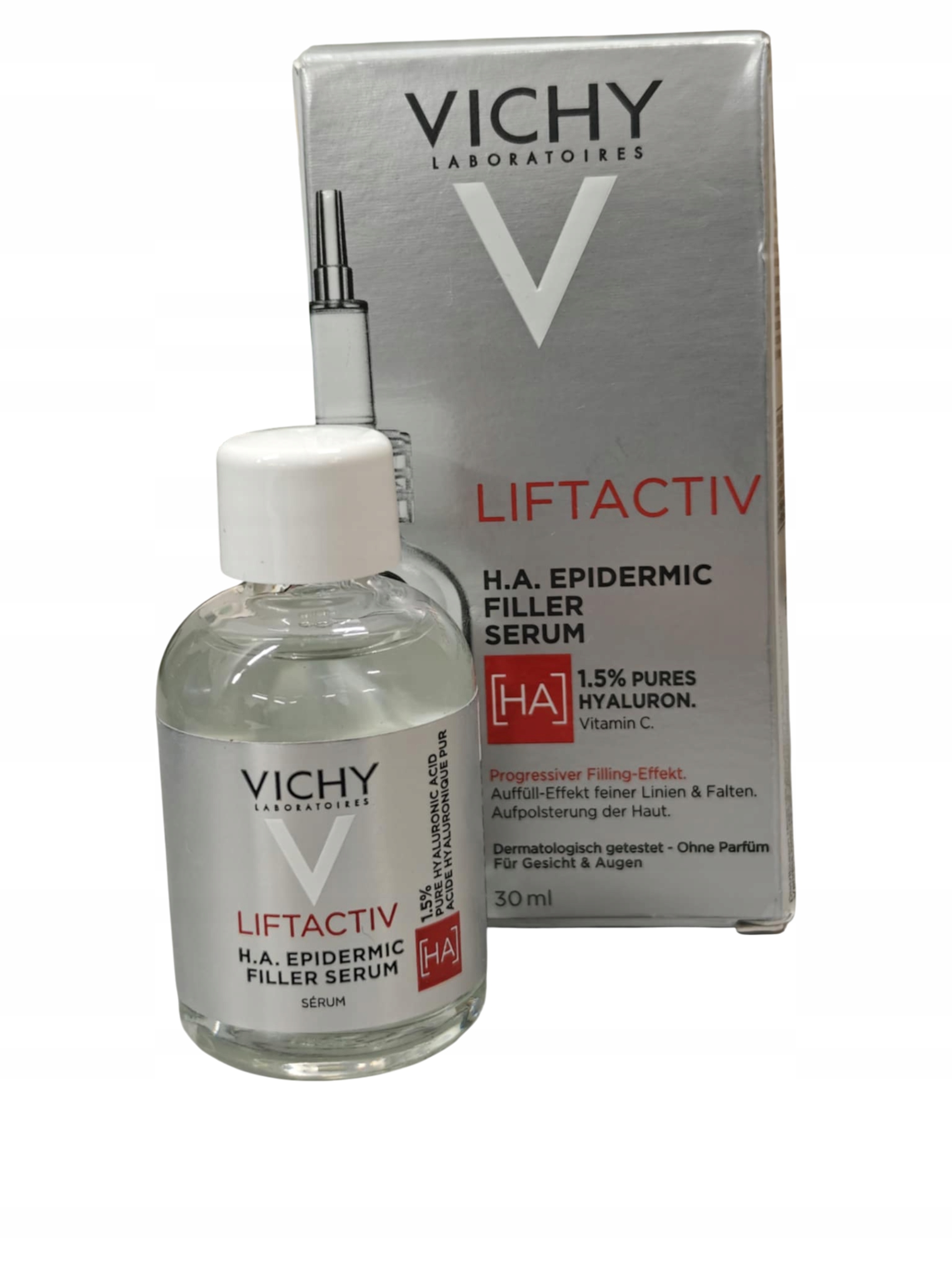 Vichy Liftactiv Supreme H.A Epidermic Filler — це концентрована сироватка проти зморшок, придатна для використання на обличчі та навколо очей. Препарат містить високу концентрацію високо- і низькомолекулярної гіалуронової кислоти, аж 1,5%. Зменшує видимість зморшок і тонких ліній, розгладжує і підвищує еластичність. Препарат інтенсивно та глибоко зволожує епідерміс. Підходить для використання на зрілій шкірі.