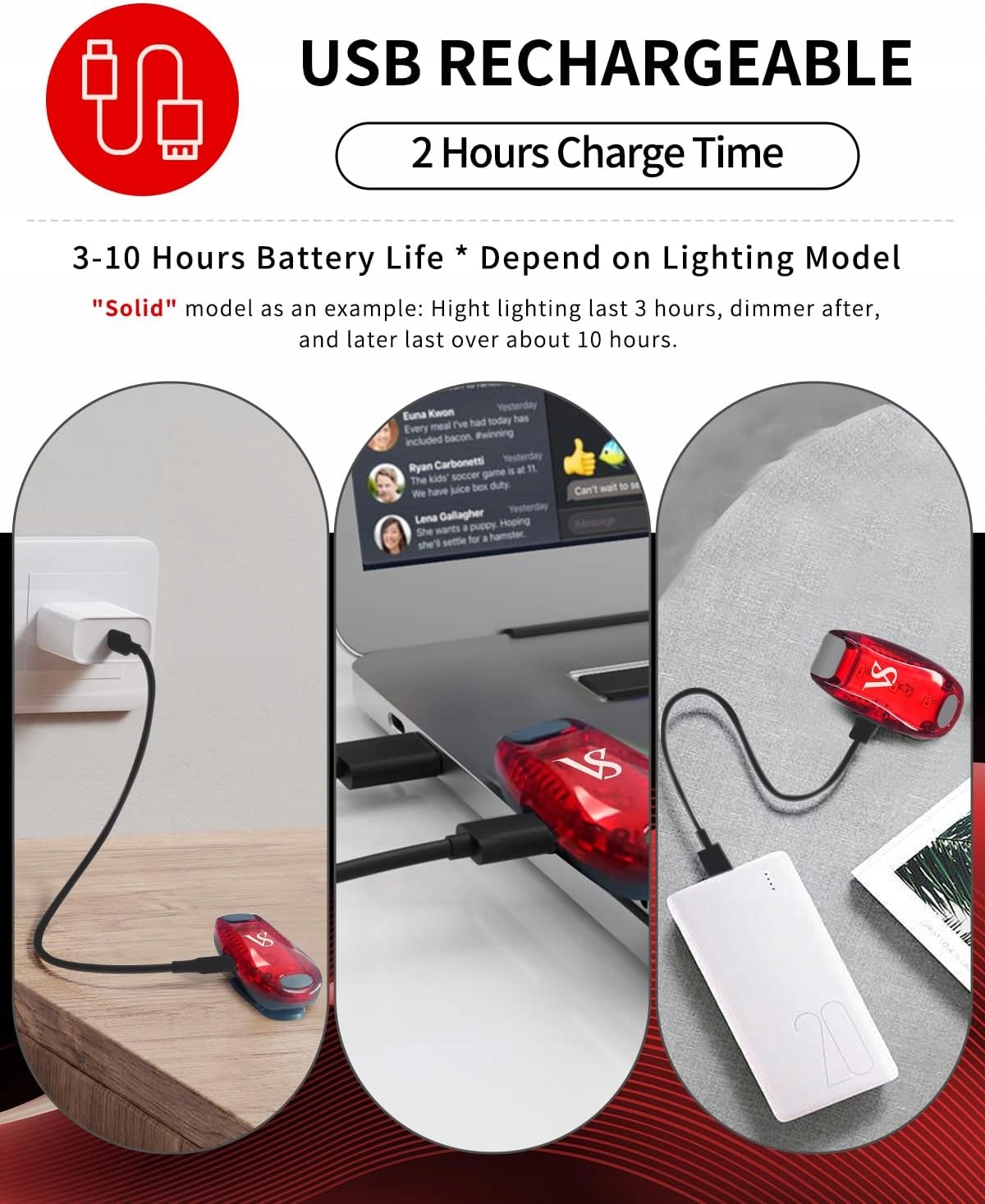 Час заряджання через USB становить приблизно 2 години, а час використання – приблизно 3-10 годин (залежно від режим освітлення). Це ідеальні ходові вогні вночі, пішохідні вогні для безпеки. і варто додати їх до свого тренувального обладнання.