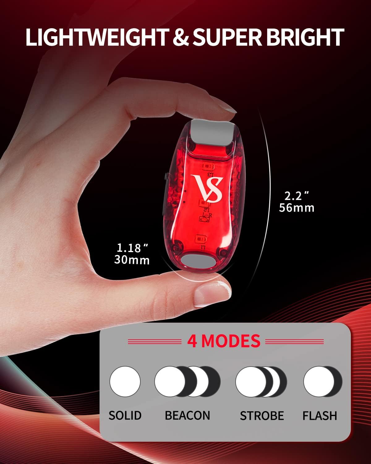 Вогні безпеки VICKSONGS мають 4 моделі світла, їх можна легко перемикати на аварійні вогні та аварійний, що забезпечує хорошу видимість. Це ідеальне освітлення для нічних прогулянок.