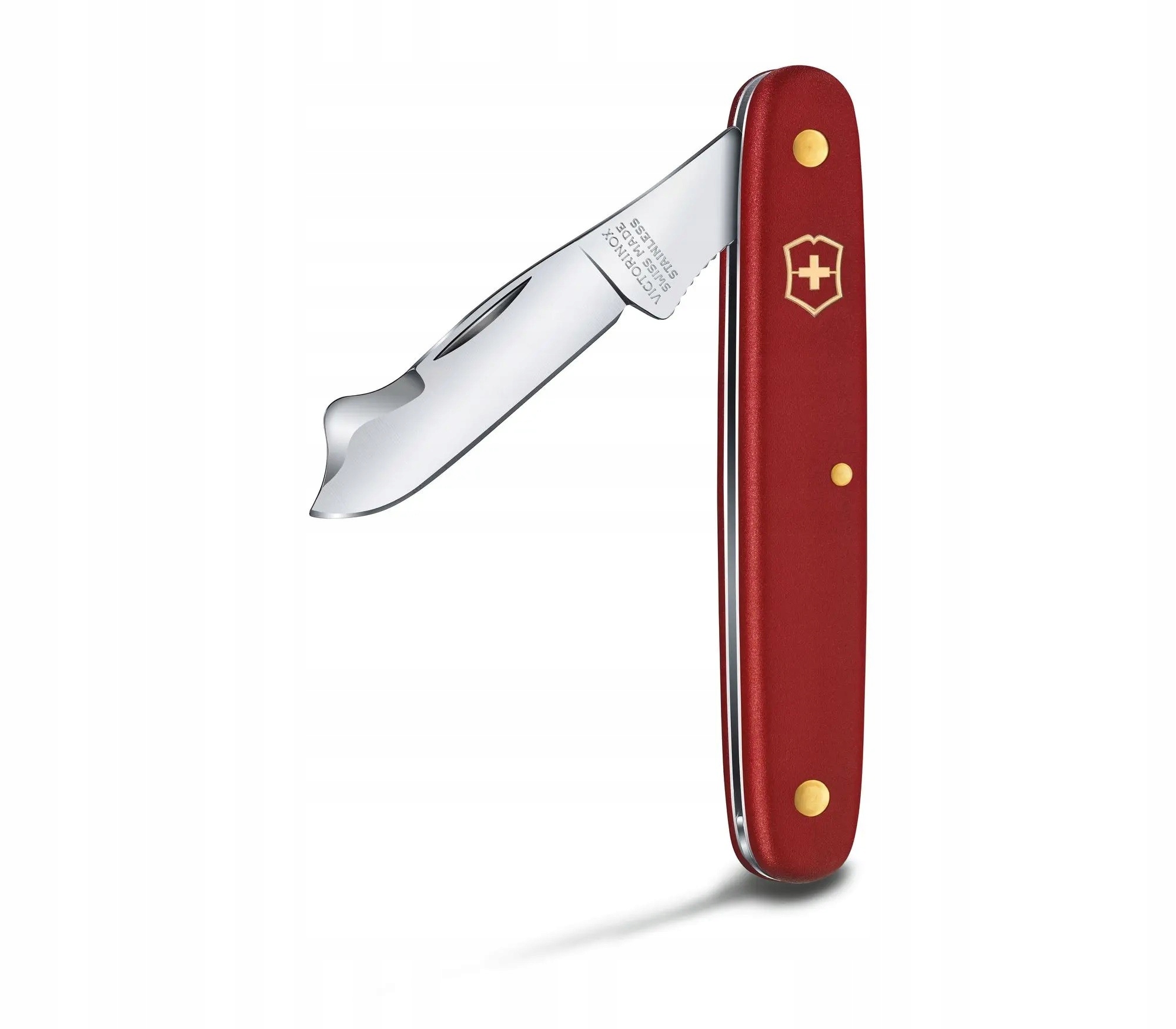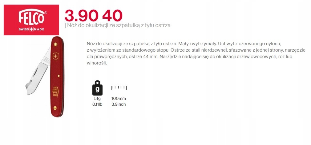 Нож для встановлення шпателя на задній частині леза. Маленький і довговічний. Червона нейлонова ручка, зі стандартним сплавом. Лезо з нержавіючої сталі, фальсифіковане з одного боку, інструмент для правого -леза 44 мм. Інструмент, придатний для встановлення фруктових дерев, рожевої або лози.
