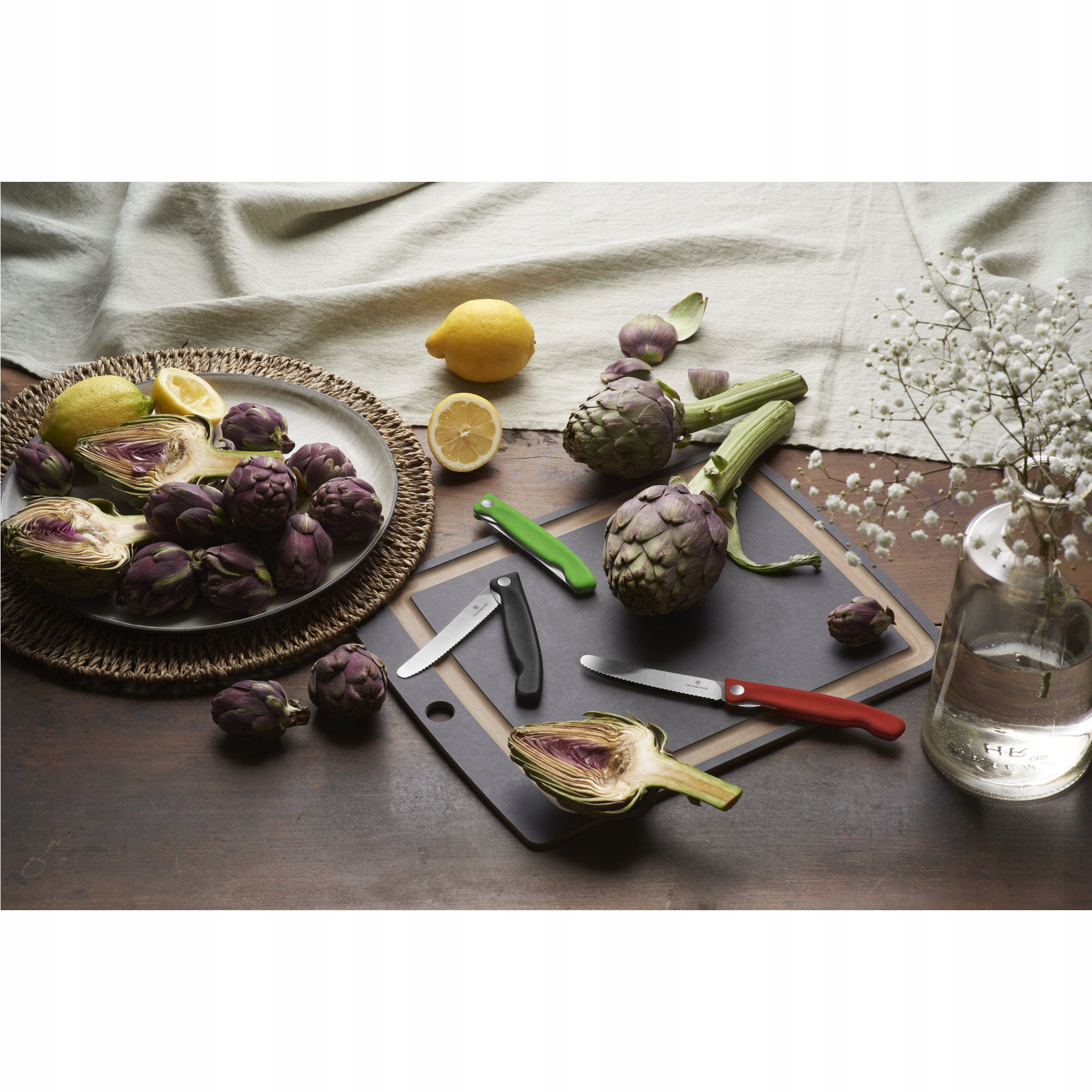 Універсальний, багатофункціональний, зручний ніж з компактним силуетом. Тепер доступний в інноваційній версії як складний, зручний швейцарський класичний ніж для фруктів та овочів. Він має компактні розміри та лезо, виготовлене з стійкої нержавіючої сталі, що може бути спритно заховане в ручці ножа. Додаткова система легкої -використання лез збільшує безпеку. Широкий асортимент барвистих ручок та практичних наборів дозволяє насолоджуватися їх якостями як на кухні, так і на свіжому повітрі. Від лущення яблук та підготовки перців чилі, до відкриття листів у домашньому офісі або носіння рюкзака під час повних пригод поїздок - цей складний, досить непомітний вигляд, легкий ніж, буде працювати майже в кожній ситуації та місцях.