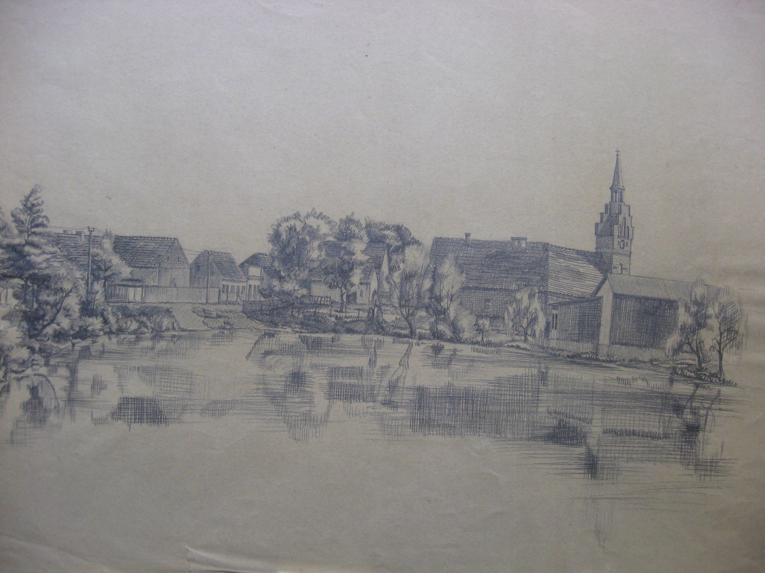 Креслення з сторони майстерні здійснюється з точною лінією з далекою доглядом за найбільш точним відтворенням панорами міста олівцем. На передньому плані видно ставок і навколо нього зібралися сільські будівлі з високим силуетом цегляної церкви з чотирикутною вежею. 4