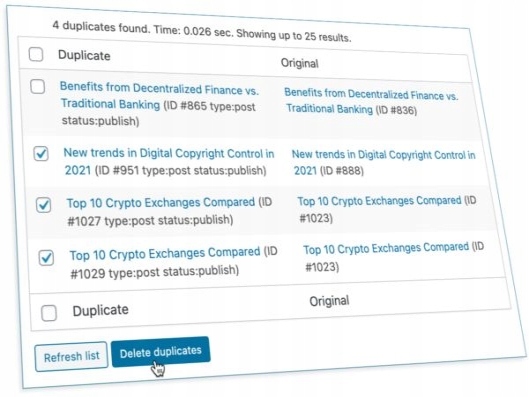 плагін плагіналегко позбутися дублікатів у WordPress. Видалення дублікатів Pros Pro - це плагін WordPress, який робить саме те, що пропонує ім'я. Плагін WordPress, який сканує заголовки сторінок з ваших публікацій або сторін - зберігає найдавнішу або останню версію та видаляє решту - включаючи всі інші додаткові дані.