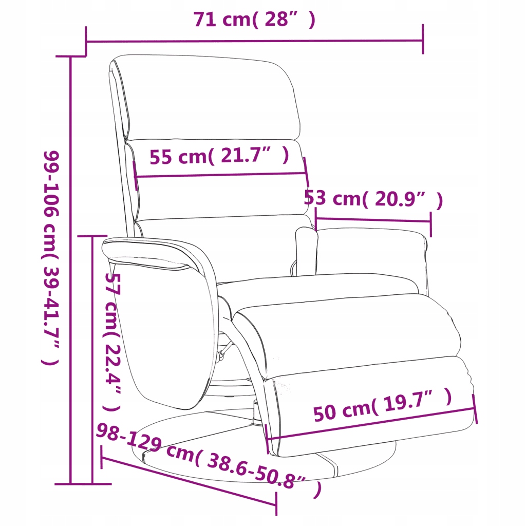 - Розміри в положенні сидячого: 71 х 98 х 106 см (W x d x h)