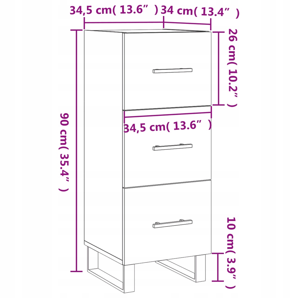 Ця сучасна шафа з позачасовим виглядом стане ідеальним доповненням до вашого дому. Міцний матеріал: матеріал на основі деревини має виняткову якість і гладку поверхню, а також характеризується довговічністю, стабільністю і вологостійкістю. Металеві ніжки: металеві ніжки додають інтер'єру сучасний і стриманий стиль, забезпечуючи при цьому стабільність. Багато місця для зберігання: меблі розроблені з 3 висувними ящиками, тож ви можете організувати всі речі, які хочете мати під рукою. Міцна і стійка верхня частина: верхня частина цієї шафи ідеально підходить для демонстрації декоративних предметів, фоторамок і рослин у горщиках. Попередження: щоб меблі не перекинулися, їх потрібно прикріпити до стіни за допомогою кріплення, що входить до комплекту.