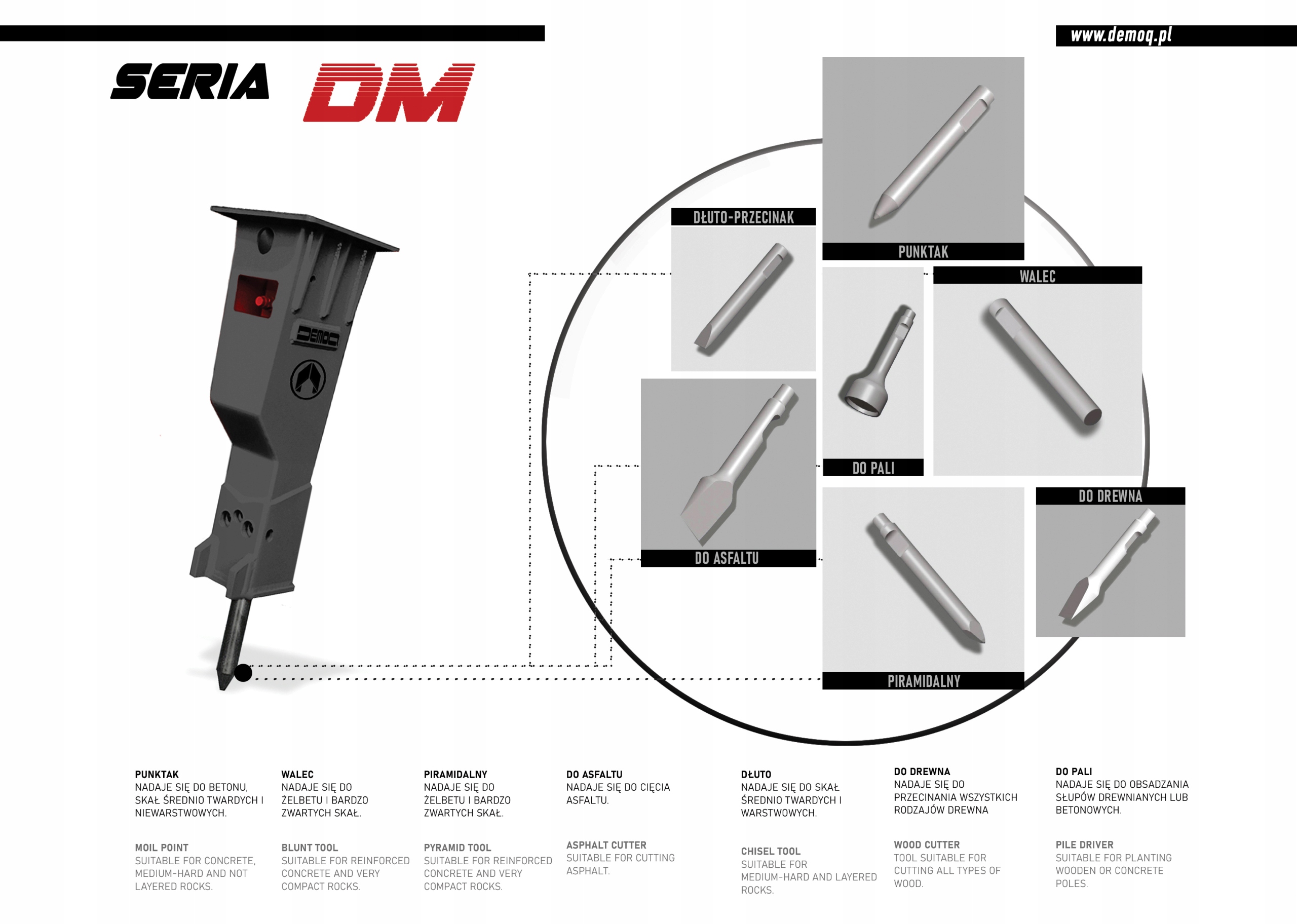 Бренд DEMOQ — це польський бренд обладнання для знесення, який пропонує молотки для знесення, дробильні щелепи, сталеві ножиці, грейфери, аксесуари для робіт у лісі та ковші для машин для всіх моделей екскаваторів. Прилади виробляються в Європі (Німеччина, Італія та Польща).