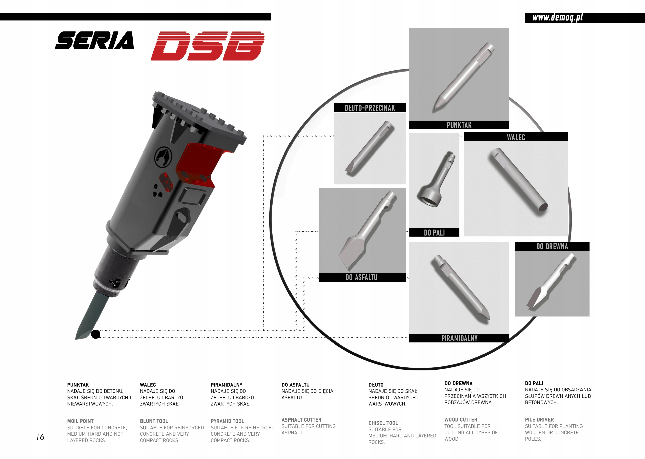 Бренд DEMOQ — це польський бренд обладнання для знесення, який пропонує молотки для знесення, дробильні щелепи, сталеві ножиці, грейфери, аксесуари для робіт у лісі та ковші для машин для всіх моделей екскаваторів. Прилади виробляються в Європі (Німеччина, Італія та Польща).