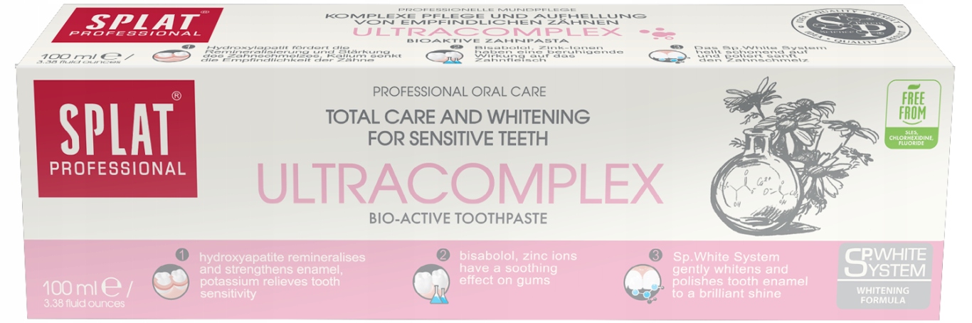 Зубна паста SPLAT ULTRACOMPLEX - це зубна паста для вимогливих людей. Містить унікальні інгредієнти, що борються з підвищеною чутливістю, і дбайливу систему відбілювання. Органічне походження - Кальцис, отриманий з яєчної шкаралупи, у поєднанні з гідроксиапатитом ефективно зміцнюють зуби, підвищують щільність емалі та усувають причини чутливості. Іони калію і цинку знижують чутливість емалі, надають в'яжучу і протизапальну дію на ясна. Зубна паста з інноваційною системою Sp.White призначена для безпечного відбілювання зубів. Не містить фтору.