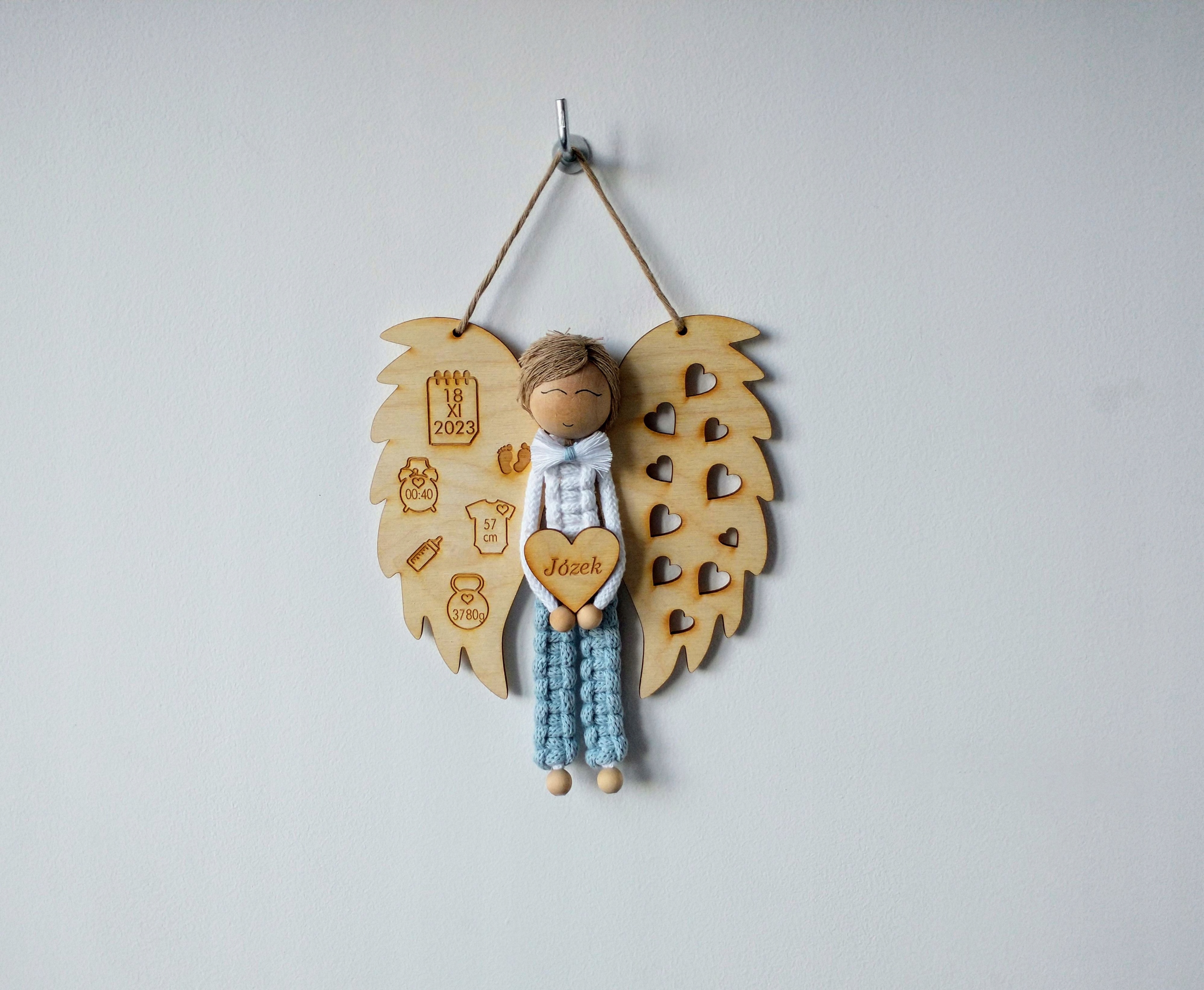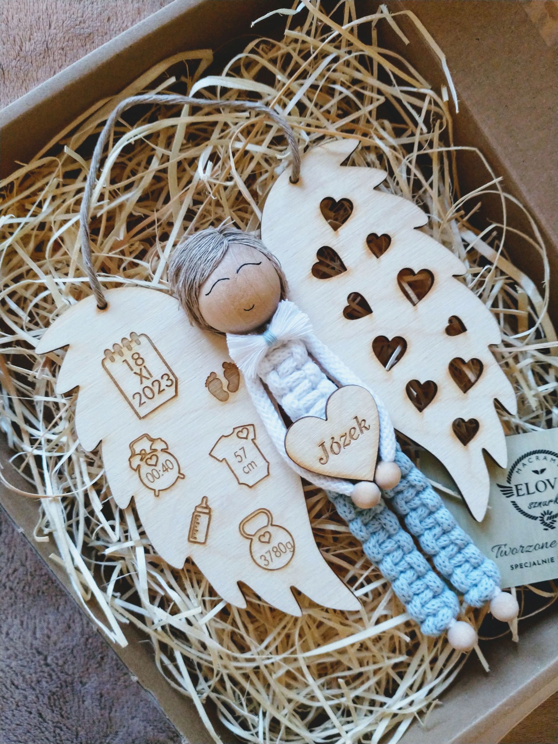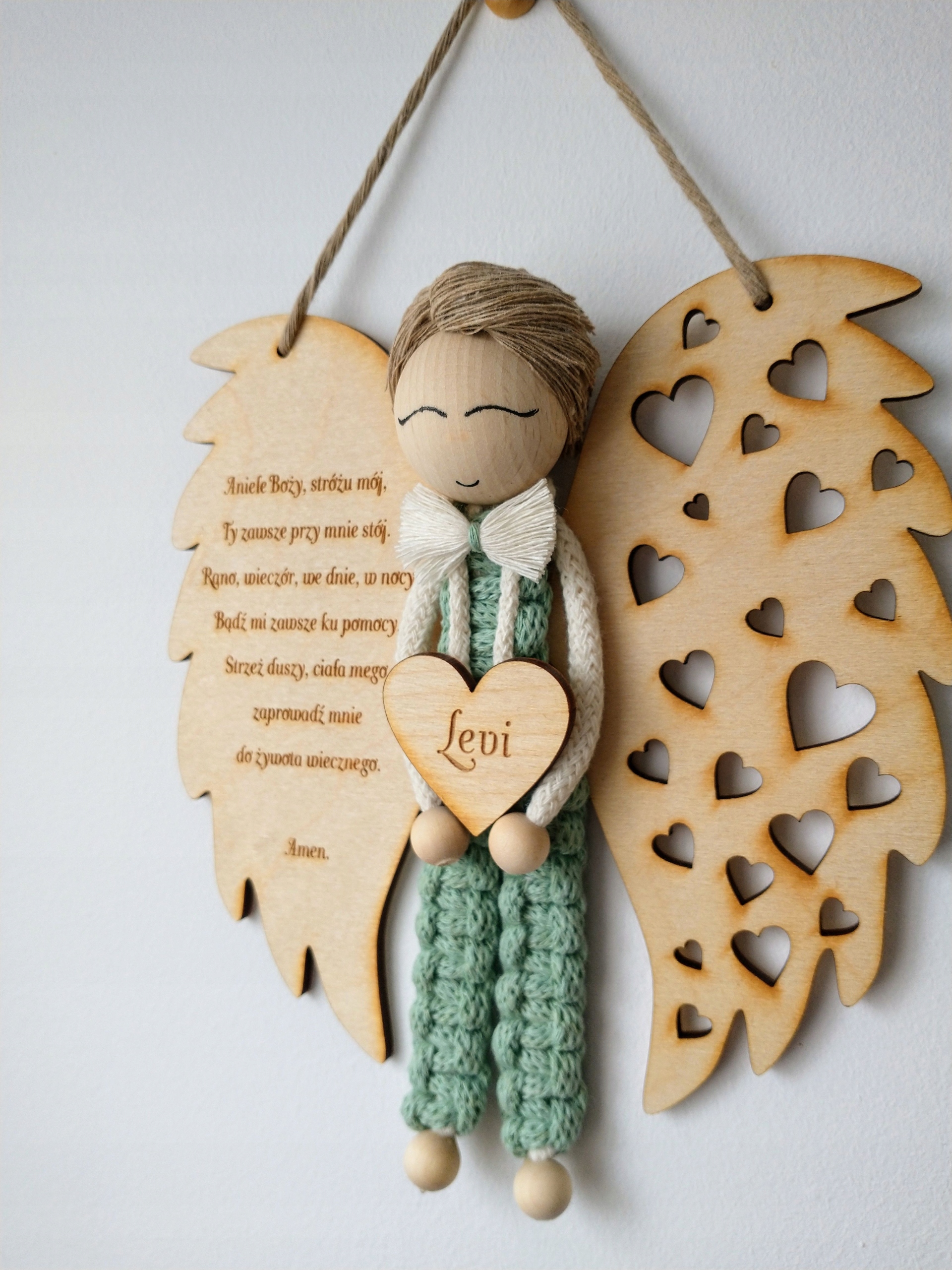 Ангел макраме з нитки 23 см, дерев'яні крильця з грамотою, варіант для хлопчика - Ідеально на подарунок :)