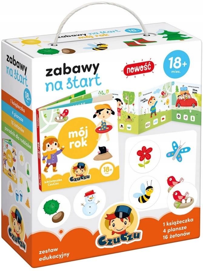 Навчальний набір містить книжку з картинками, першу просту гру та посібник для батьків. Перегляд книжок спонукає дітей шукати деталі та грати з повторюваними звуками. Гру, що складається з 4 дошок і 16 жетонів, можна легко адаптувати до навичок дітей. Посібник для батьків містить ідеї для спільної гри та інформацію про розвиток дітей. Початкові ігри розвивають спілкування, мову та ручні навички.