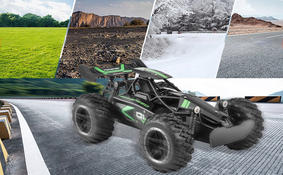 Позашляховик RC виготовлений з високоякісної ABS, з міцною оболонкою та переднім і заднім бамперами, який має хорошу ударостійкість і може швидко регулювати свій статус, навіть якщо він зіткнеться зі стіною чи іншим бампером автомобіля, автомобіль оснащений високозносостійкими шинами, може використовуватися на різноманітній місцевості, наприклад на пляжах, водно-болотні угіддя, сільські місцевості тощо