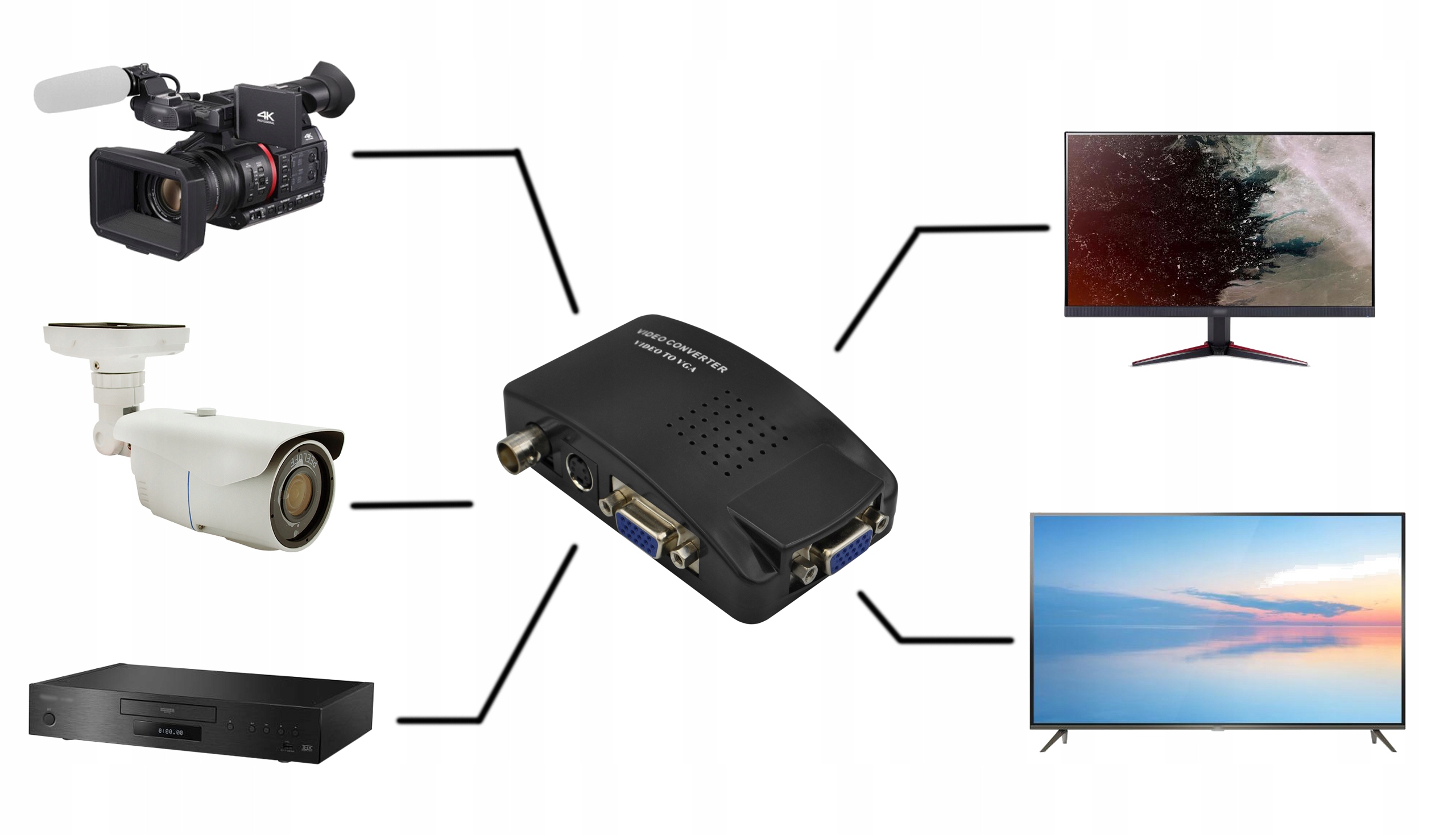 Компактний конвертер BCN/S-Video у VGA, який дозволяє підключити рекордер, цифрова камера та інші пристрої з виходом CVBS, S-Video або VGA до монітора, телевізора чи іншого приймача з входом VGA.
