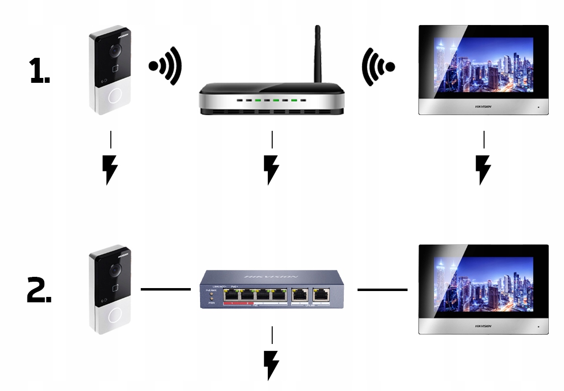 На додаток до стандартного дротового підключення за допомогою PoE Switch, пристрої також мають можливість підключатися один до одного бездротовим способом, що зменшує кількість кабелів і збільшує комфорт користування, завдяки чому відеодомофон стає ще зручнішим.