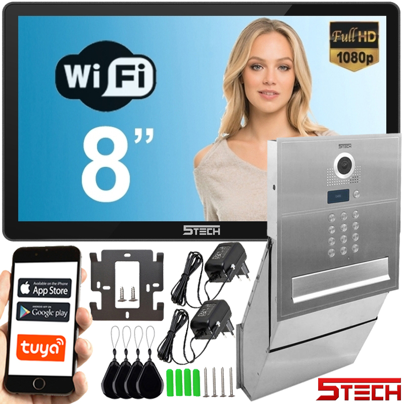 5TECH односімейний відеодомофоніз вбудованою поштовою скринькою,шухлядою для товщина стінки 19-27 см 8" ЕКРАН з Wi-Fi картою, станція з поштовою скринькою з FULL HD камерою 2 Mpix. , 170°, брелок READER і ENCODER, функції відкриття GATE і GATE p>