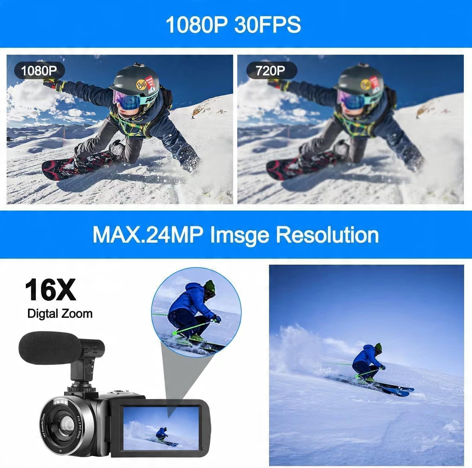 【Full HD-камера】 Цифрова камера YouTube оснащена записами та фотографуванням фільмів, підтримує фільми в Full HD 1080p (30 кадрів в секунду) та фотографії в роздільній здатності 24 Мп, а також записують цікаві моменти на 3,0-дюймовому екрані IPS. Він має 16-кратний цифровий масштаб та дистанційне управління. Це портативна цифрова камера, яку ви можете взяти з собою. Це ідеальна камера для друзів та дітей для подарунка.