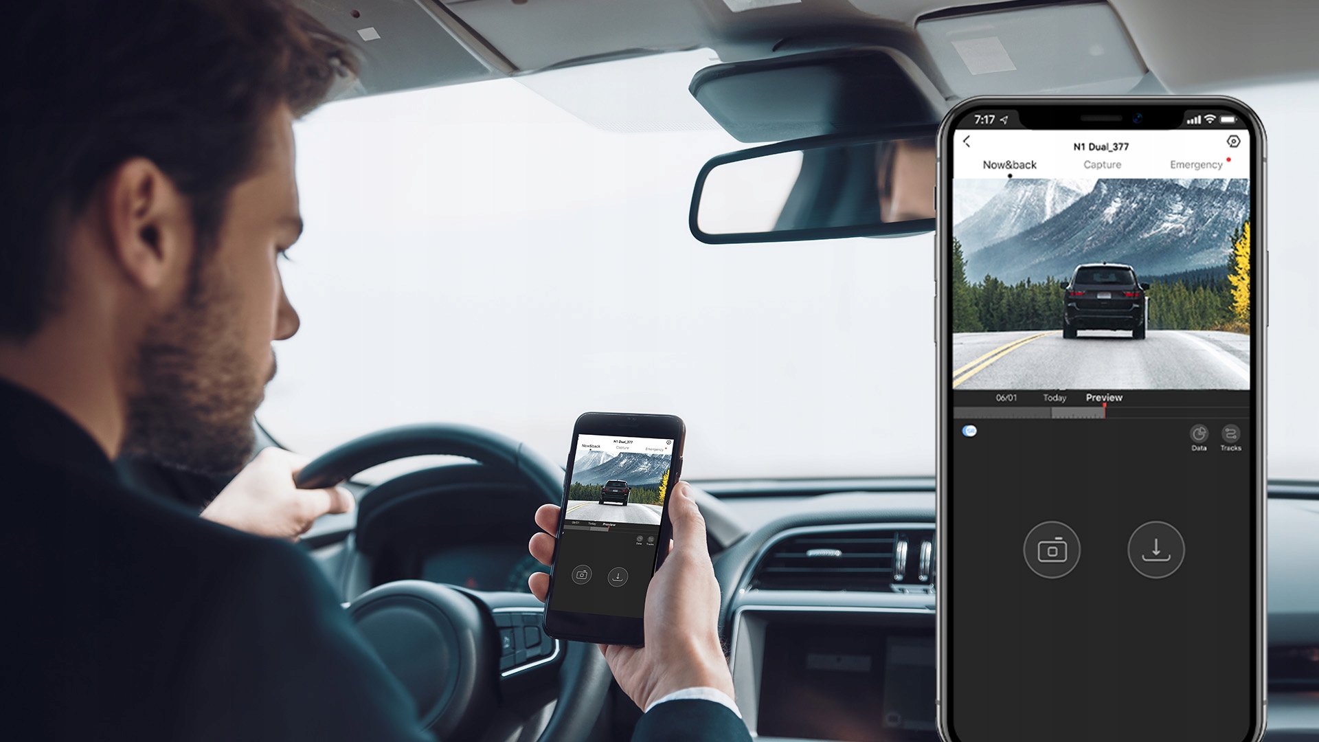 Фронтальна камера N1 Dual записує зображення з роздільністю 2340x1296, а задня камера записує зображення з роздільністю 1920x1080, одночасно записуючи види з передньої та задньої частини автомобіля або з салону (задня камера може повертатися, щоб записувати зображення всередині автомобіля). Наші комплексні функції моніторингу забезпечують безпечніший і комфортніший досвід.