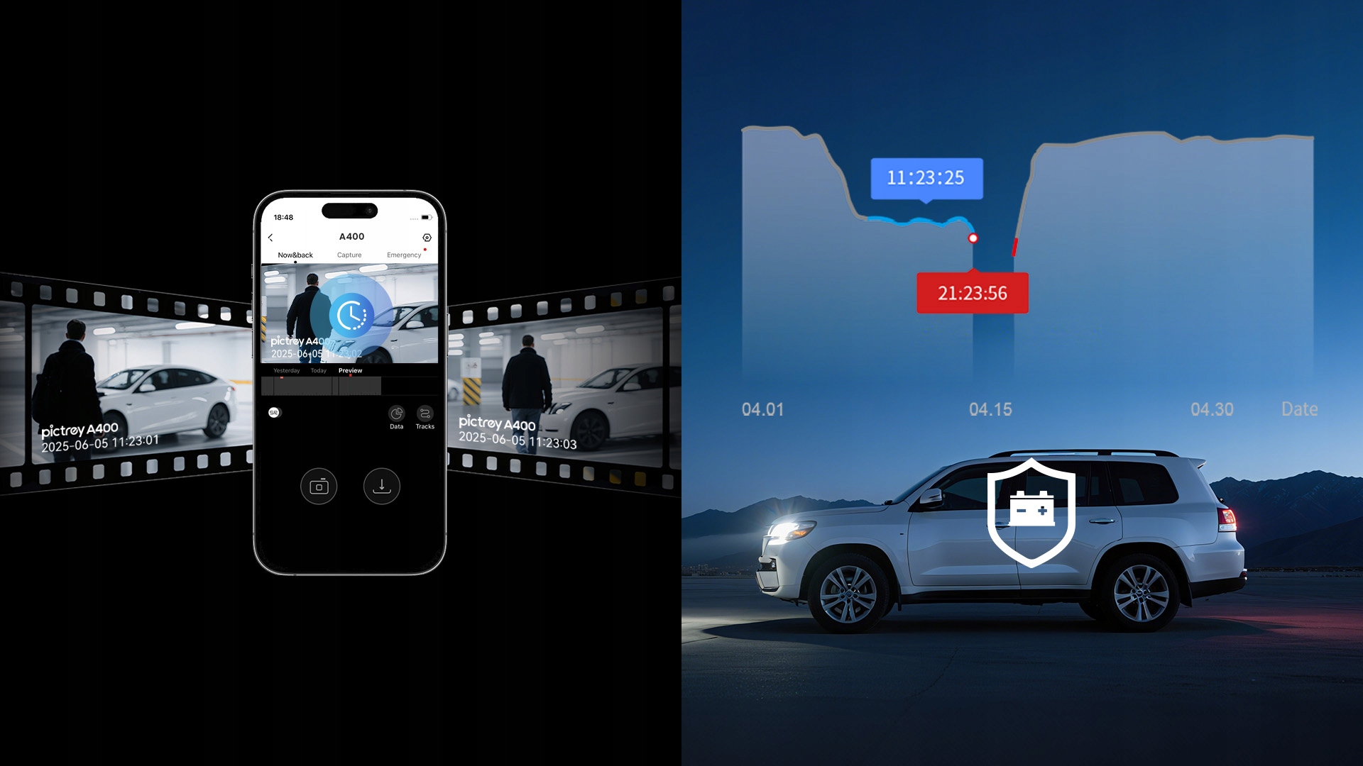 A400 оснащено системою керування живленням IPS, яка постійно контролює напругу автомобільного акумулятора. Автоматично вимикає живлення, коли напруга падає нижче встановленого порогу, дозволяючи вам у будь-який час контролювати напругу акумулятора за допомогою програми DDPAI.