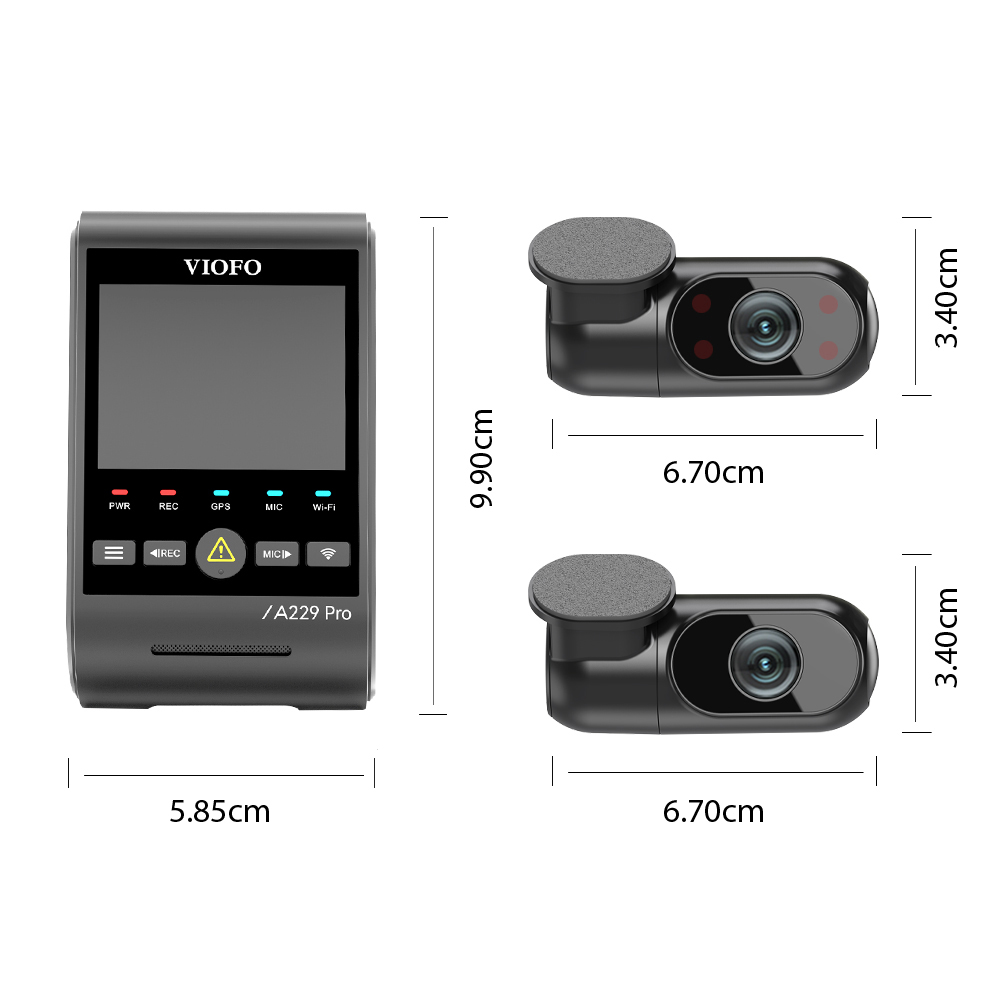 VIOFO A229 PRO має непомітний головний модуль без дисплея, який також виконує роль фронтальної камери. Модуль має вбудований GPS і WIFI, що працює в діапазонах 2,4 ГГц і 5 ГГц. Також до основної частини набору кріпимо внутрішню камеру з ІЧ-діодами та камеру заднього виду.