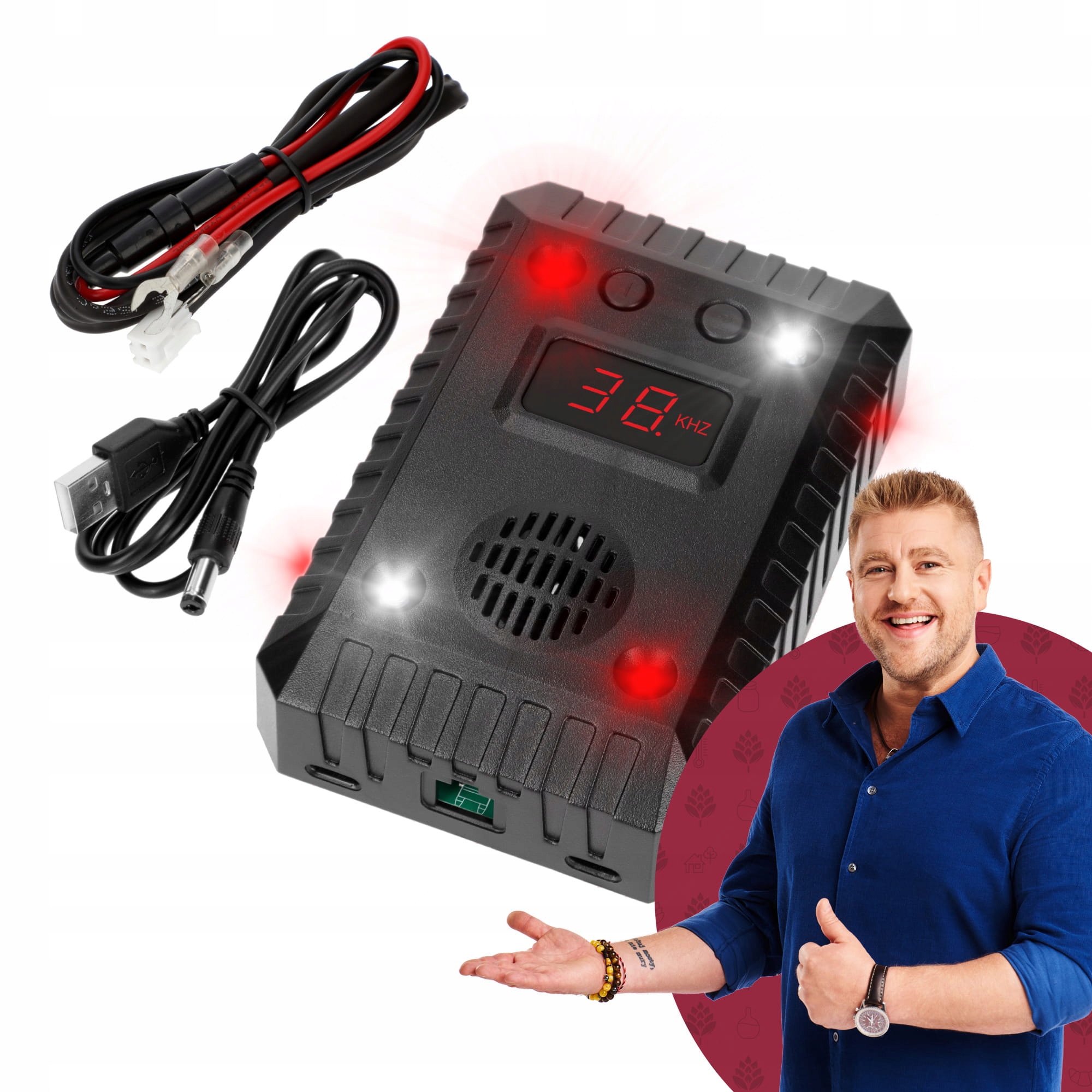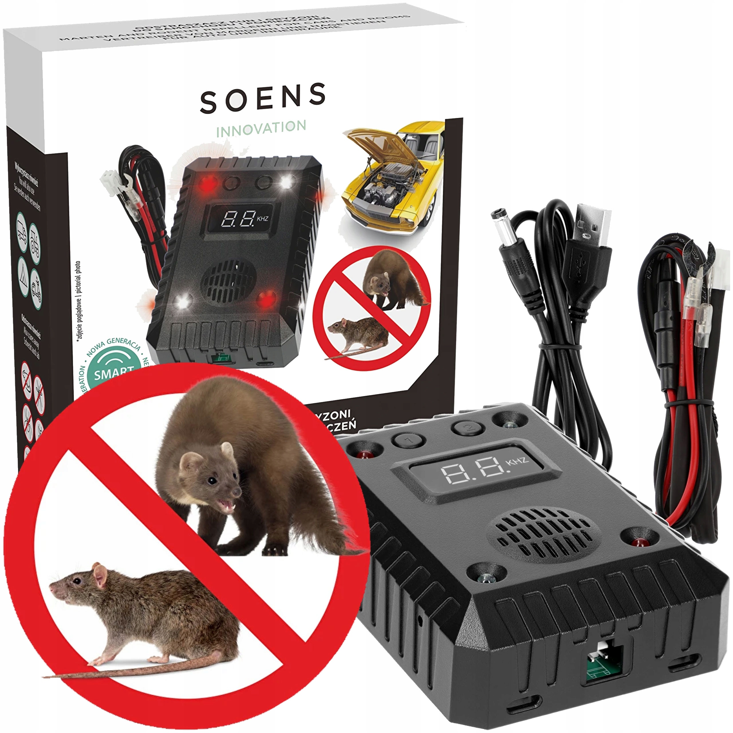 Цей відлякувач є практичним пристроєм «встав і забудь» — він автоматично вмикається та вимикається. Ви можете встановити його в сільськогосподарську техніку, скутери та вантажівки. USB порт дозволяє використовувати пристрій поза автомобілем, в житлових і підсобних приміщеннях. Він також добре працюватиме під час кемпінгу чи кемпінгу. Відлякує гризунів і куниць. Тварина не звикає до звуку, який створюється завдяки змінній частоті. Відштовхувальний ефект посилений світлодіодним світлом.